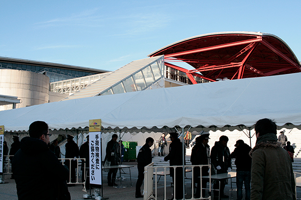 真っ青な下、東京オートサロン 2019の会場には、早くから報道関係者が続々と集まってきています。
