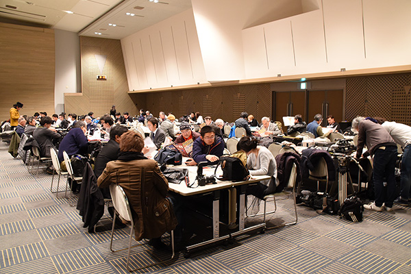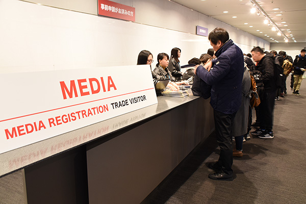東京オートサロン初日の1月11日(金)は、特別公開日となります。この日は、業界&報道関係者招待日ということで、午前はメディア(マスコミ)招待時間となります。朝から記者発表会が目白押し。メディアの受付には早朝から多くの関係者が詰めかけます。そしてプレスルームも開場前から多くの人で熱気ムンムンです。