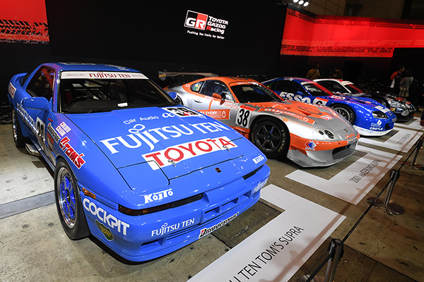 その舞台の後ろには、グループAに参戦していた先々代の70型スープラから、全日本GT選手権を走った先代の80型スープラ、そして2007年に十勝24時間レースに参戦したハイブリッド仕様の80型スープラという4台のレーシングマシンも並びます。