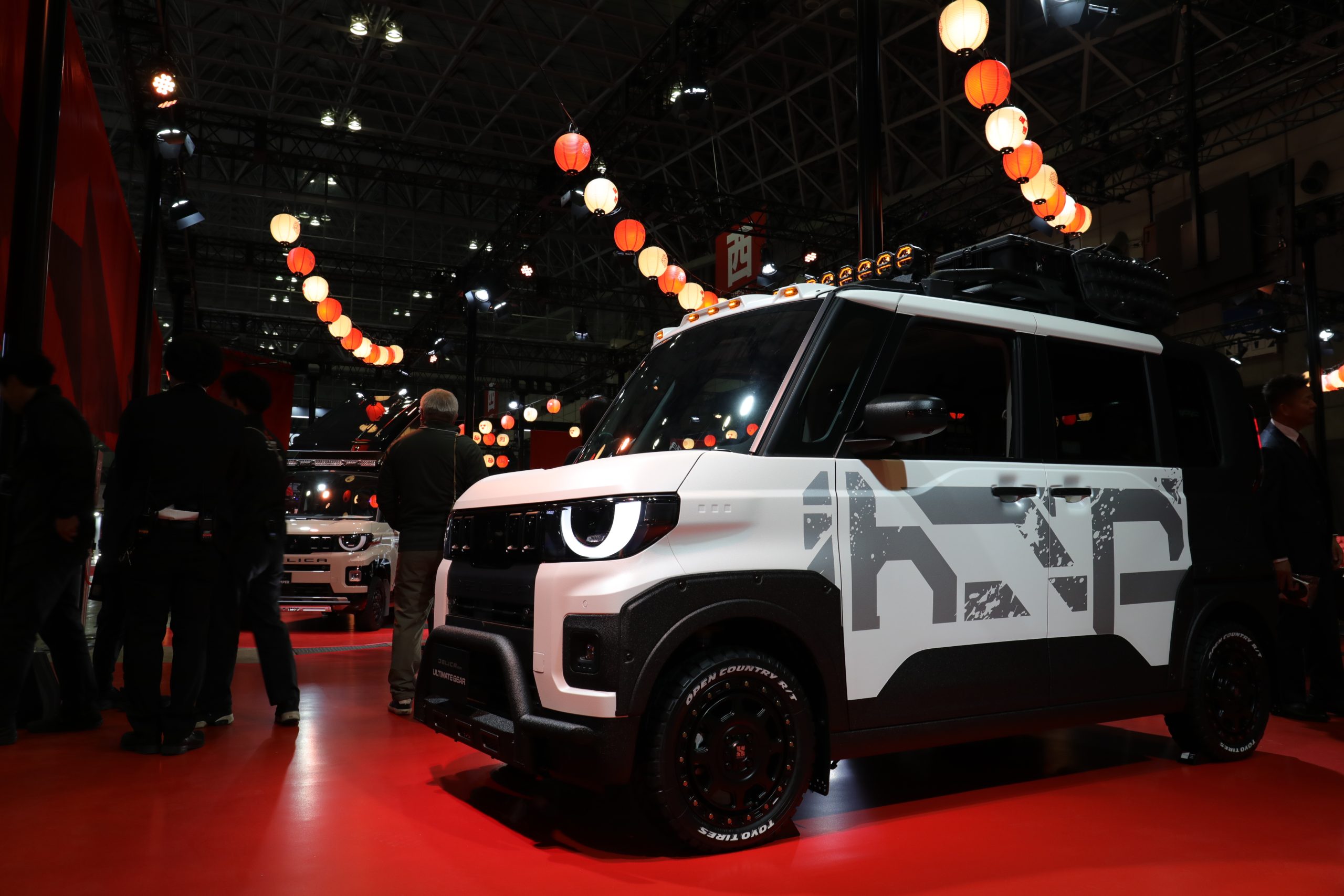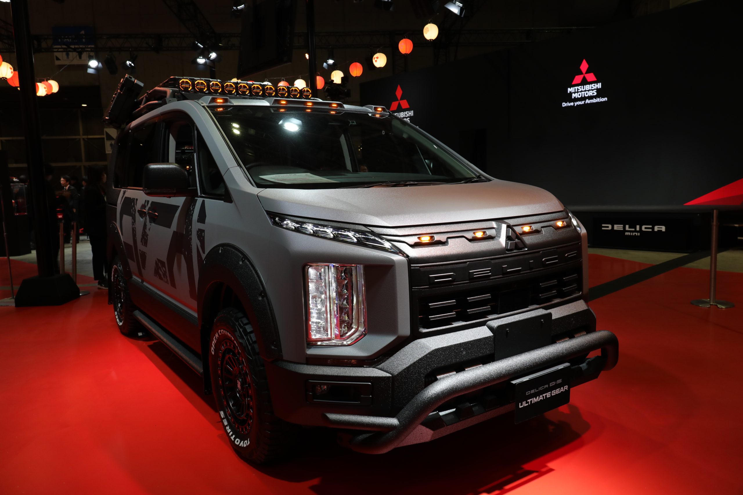 「デリカD:5」と「デリカミニ」をタフスタイルへと変貌したこれらの車両は、「デリカD:5 ULTIMATE GEAR(アルティメットギア)」と「デリカミニ ULTIMATE GEAR(アルティメットギア)」です。リフトアップ、ざらざらとしたマットな質感が特徴のラプター塗装、バンパーガードなどを装着し、どこまでも悪路をかけて抜けていくイメージに仕上がっていました。