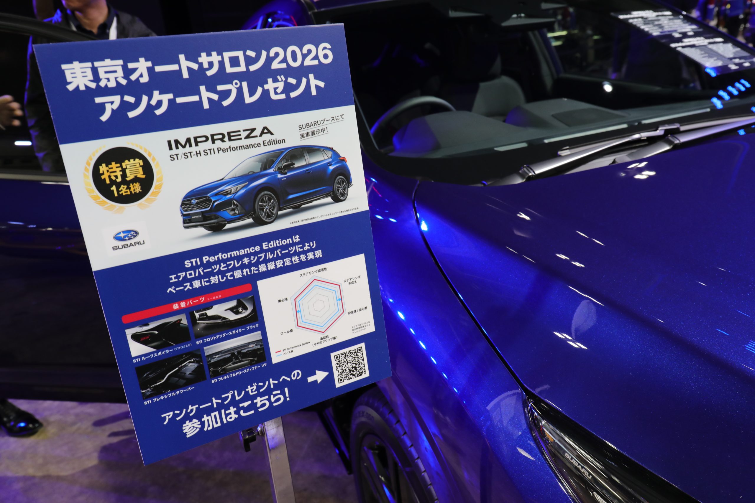 こちらの「インプレッサ」は、「ST-H」グレードをベースに、STIパフォーマンスパーツを装備した「IMPREZA ST/ST-H STI Performance Edition PLUSパッケージ装着車」です。2026年のアンケートプレゼントの特賞でもあるので、実車をご覧になって、当選する夢を膨らませるのも楽しいでしょう!