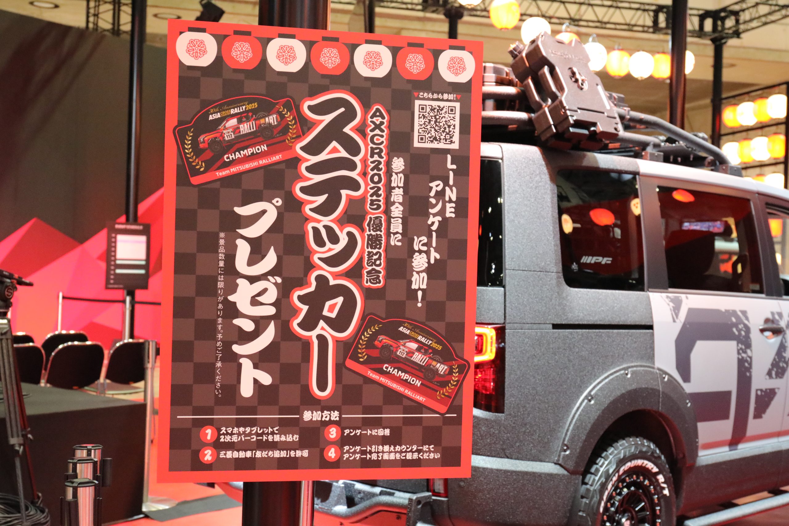 開催期間中は、AXCR2025優勝記念ドライバーズトークや、デリカ祭スペシャルカスタムトークなども実施予定。また、ブースでLINEアンケートに参加すると、AXCR2025優勝記念ステッカーがもらえるプレゼントキャンぺーンも実施中です。お祭り気分で盛り上がる、三菱自動車工業株式会社ブースにお越しください!