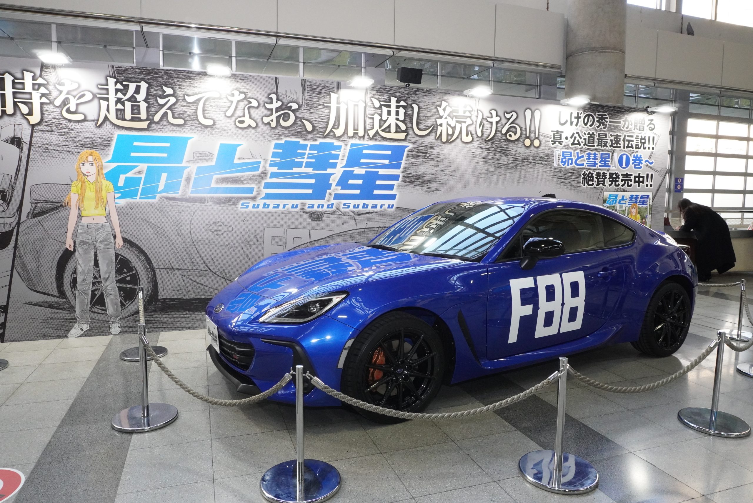 今回のオートサロンではこれらしげの作品3作合同の特別ブースが展開され、多くの来場者で賑わっていた。ブースには、今冬から始まったTVアニメ「MFゴースト 3rd Season」と、単行本1巻が発売したばかりの「昴と彗星」、そしてこれら2作品の元祖でもある頭文字Dにそれぞれ登場する、主人公のクルマの実車を展示。東ホールの2F通路プロモーションブースという場所柄もあり、多くの来場者が足を止め、思い思いに写真や動画を撮影する姿が見られた。