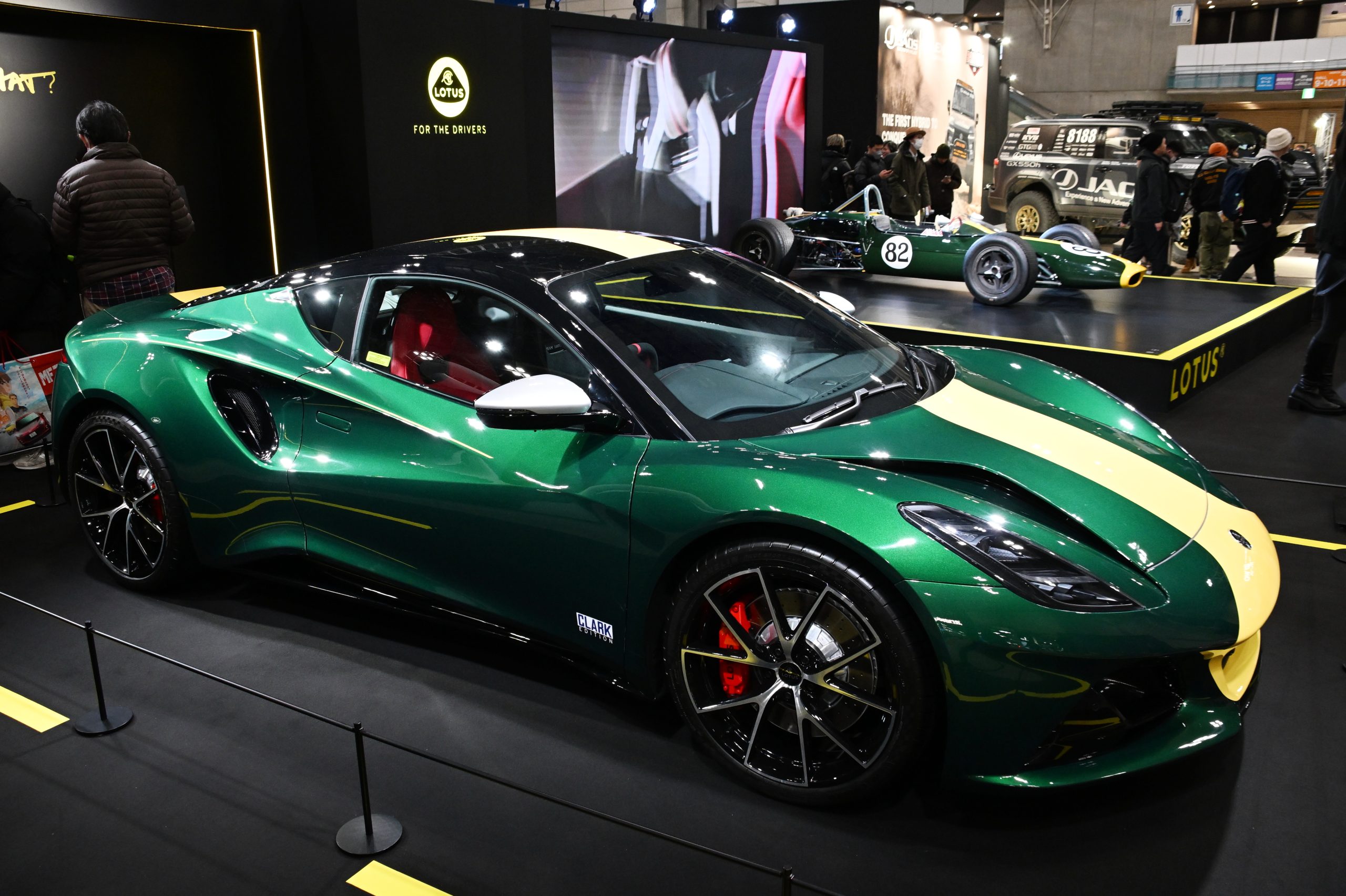 伝説のドライバー、ジム・クラークは、1965年にチーム・ロータスとともにF1ワールドチャンピオンを獲得し、同時に、インディアナポリス500マイルレース(インディ500)を制覇。同じ年にF1とインディ500を同時制覇した唯一のドライバーです。そのクラーク氏への敬意を込めたロータス・エミーラの特別仕様車「エミーラ・クラーク エディション」を今回の東京オートサロンでお披露目しました。