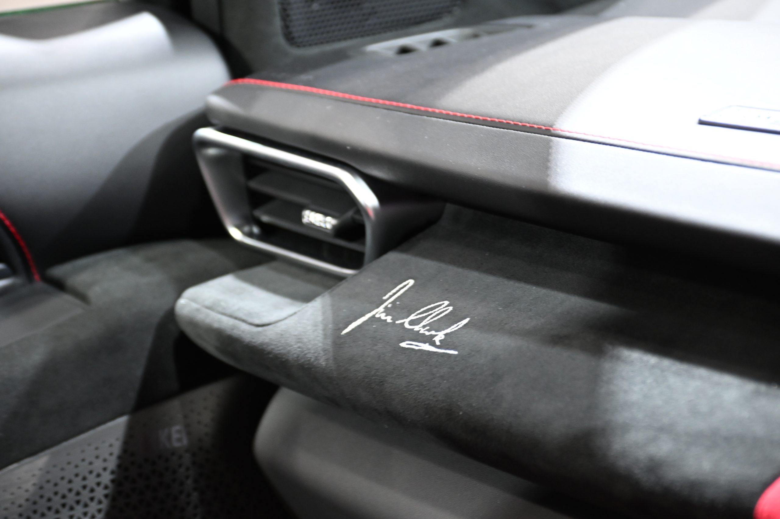 インディ・グリーンにへセル・イエローのストライプの入った外装には、フロントノーズにある黒ベースのエンブレムや、陽極酸化処理された水色の給油口、シルバーのドアミラーキャップと、1965年にクラークが駆ったマシンを思わせる仕上がりで、内装も運転席はレッドに、そしてウッドのシフトノブを採用。ダッシュボードにはジム・クラークのサインが刺繍されています。