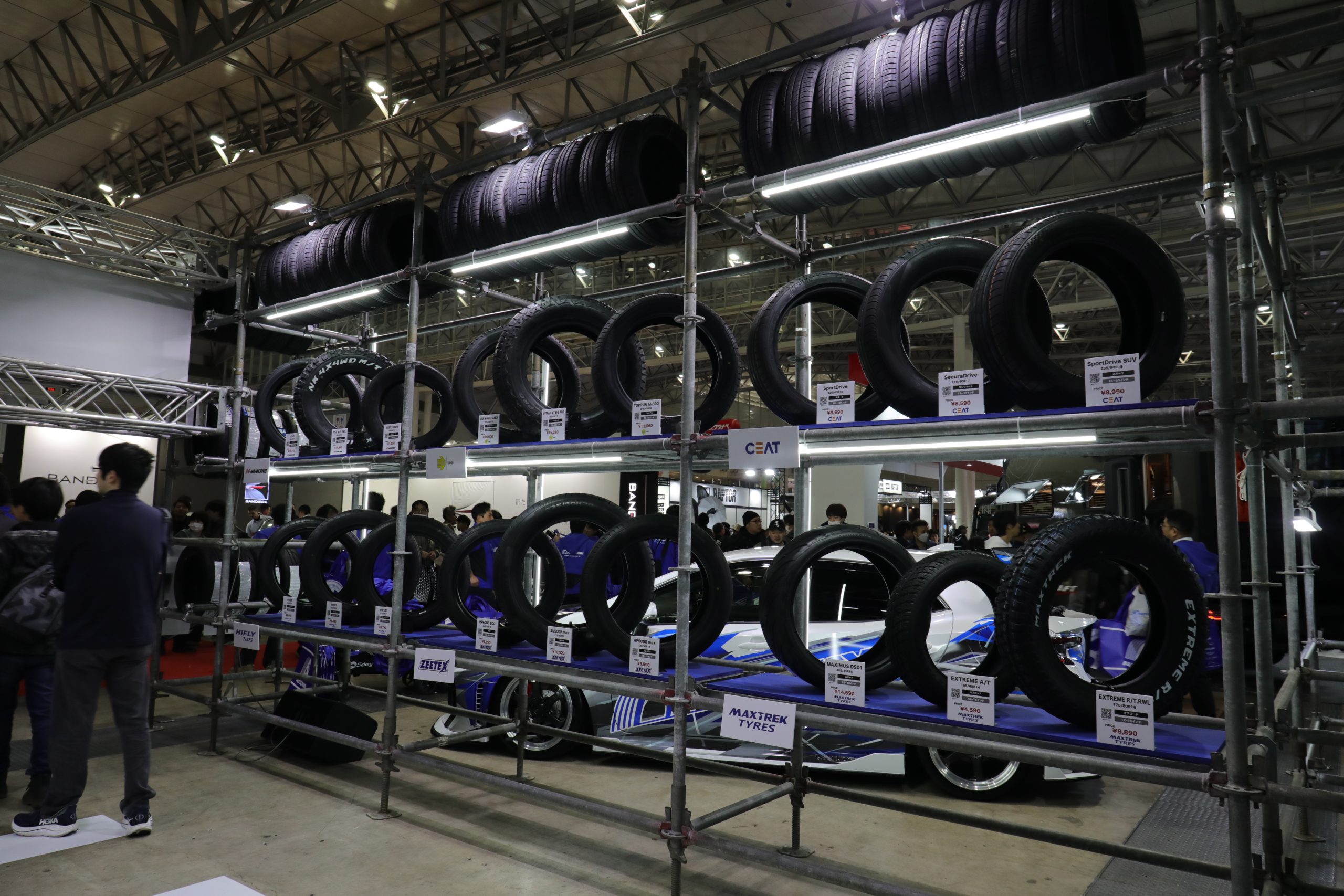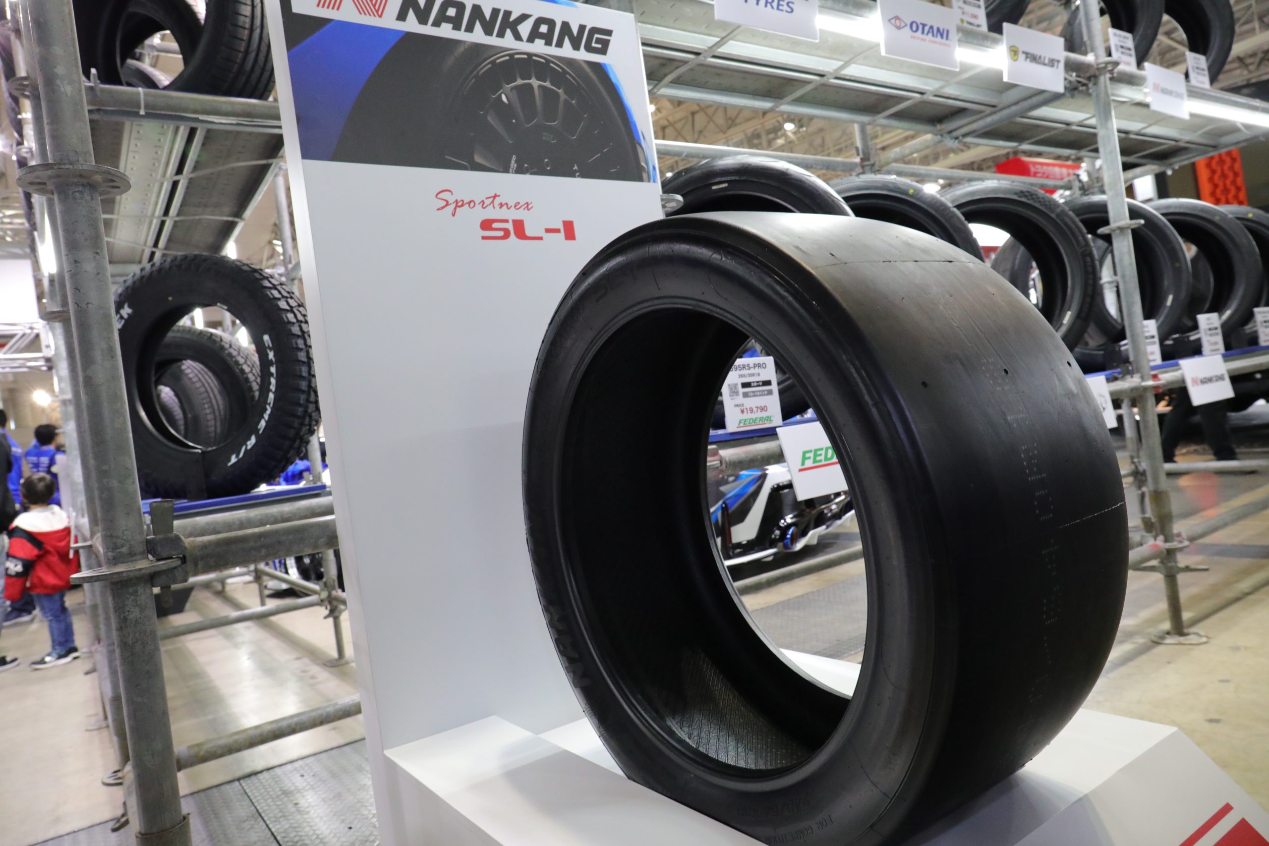 ブースはリアルな倉庫をイメージさせる雰囲気で、同社が扱う世界各国のブランドが多数展示されていました。有名な「NANKANG」をはじめ、「DAVANTI TYRES」、「momo TIRES」、「COOPER TIRES」、「HIFLY」、「FINALIST」など、日常使用からモータースポーツシーンまで、様々な使用用途をカバーするたくさんのブランドのタイヤがブースに並ぶ姿は圧巻です。