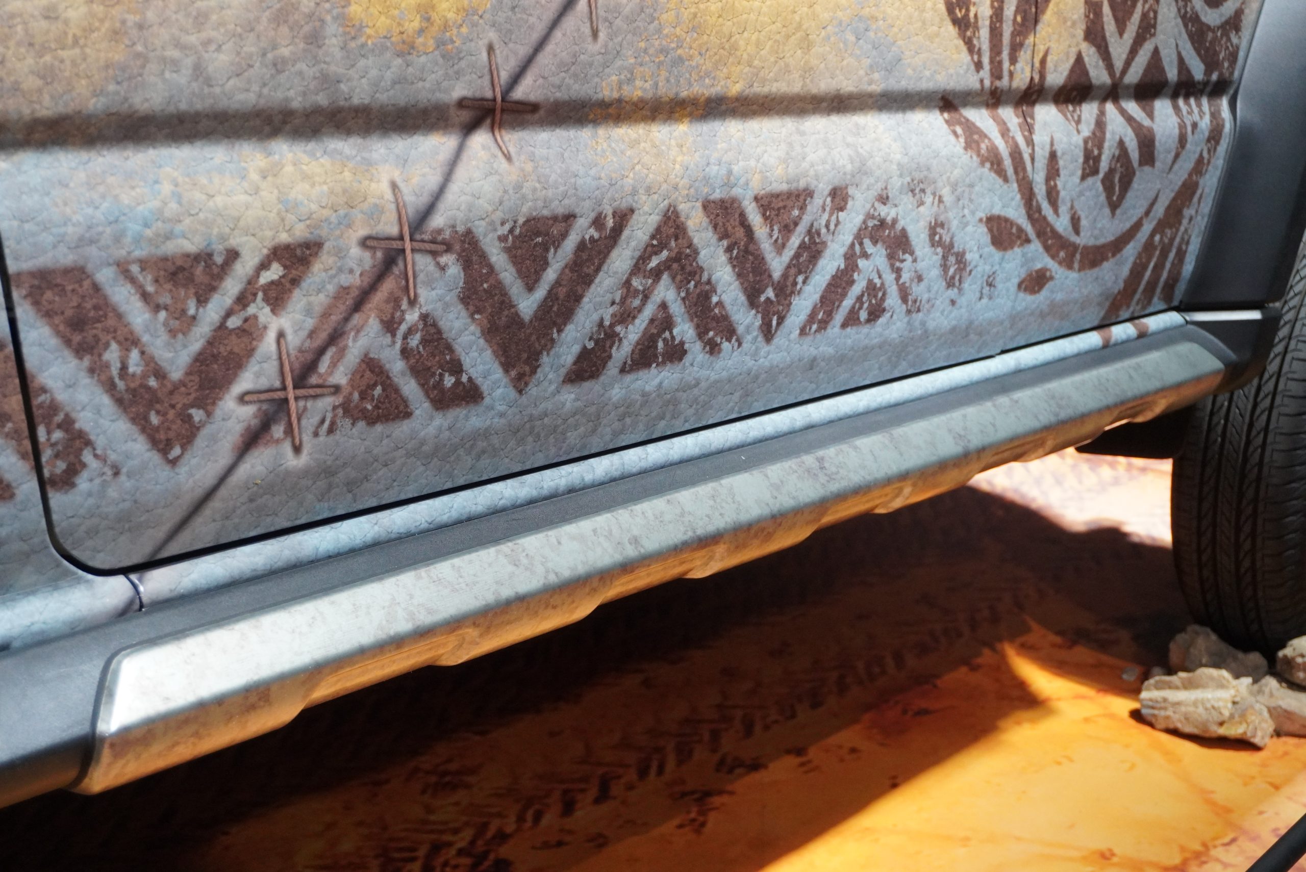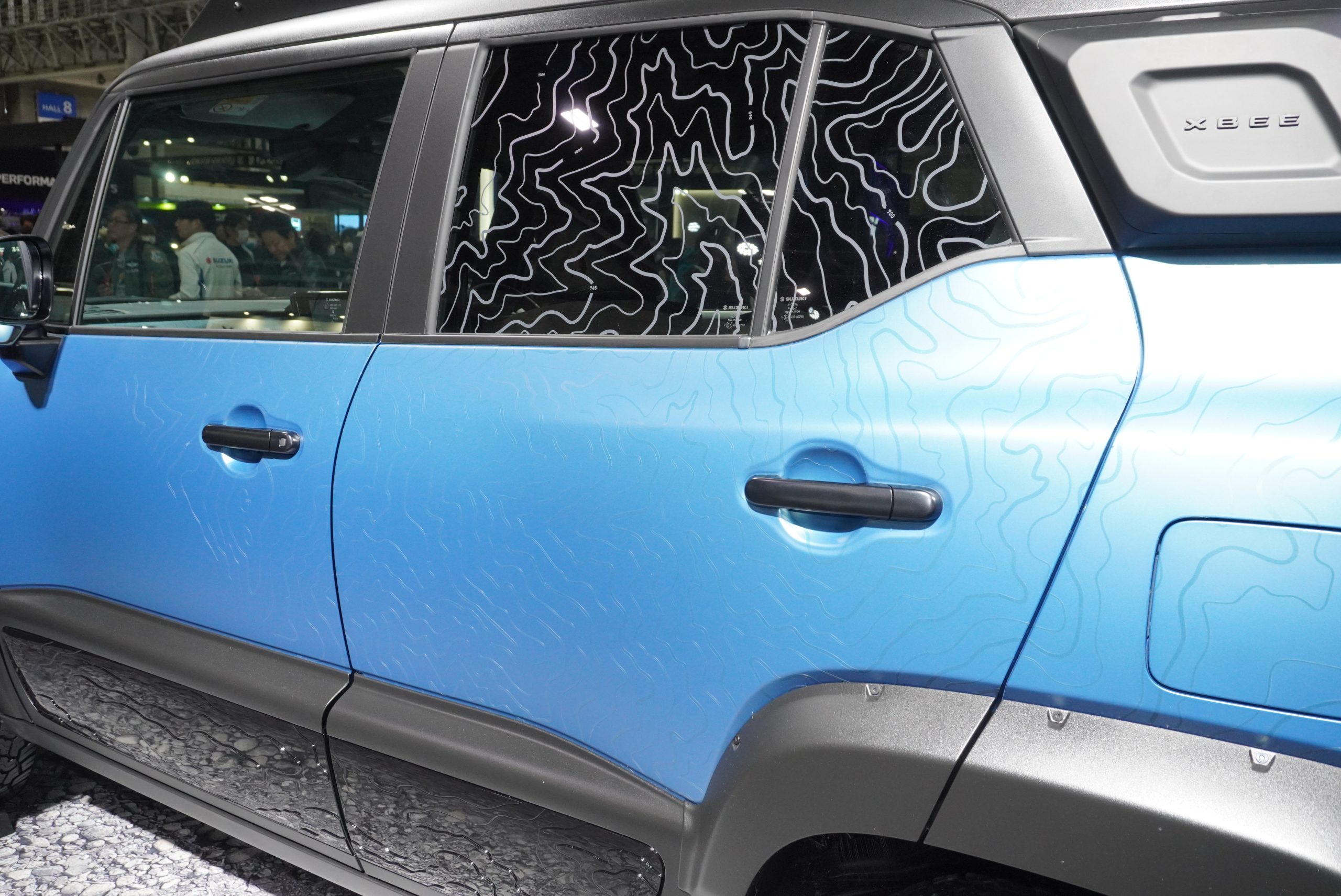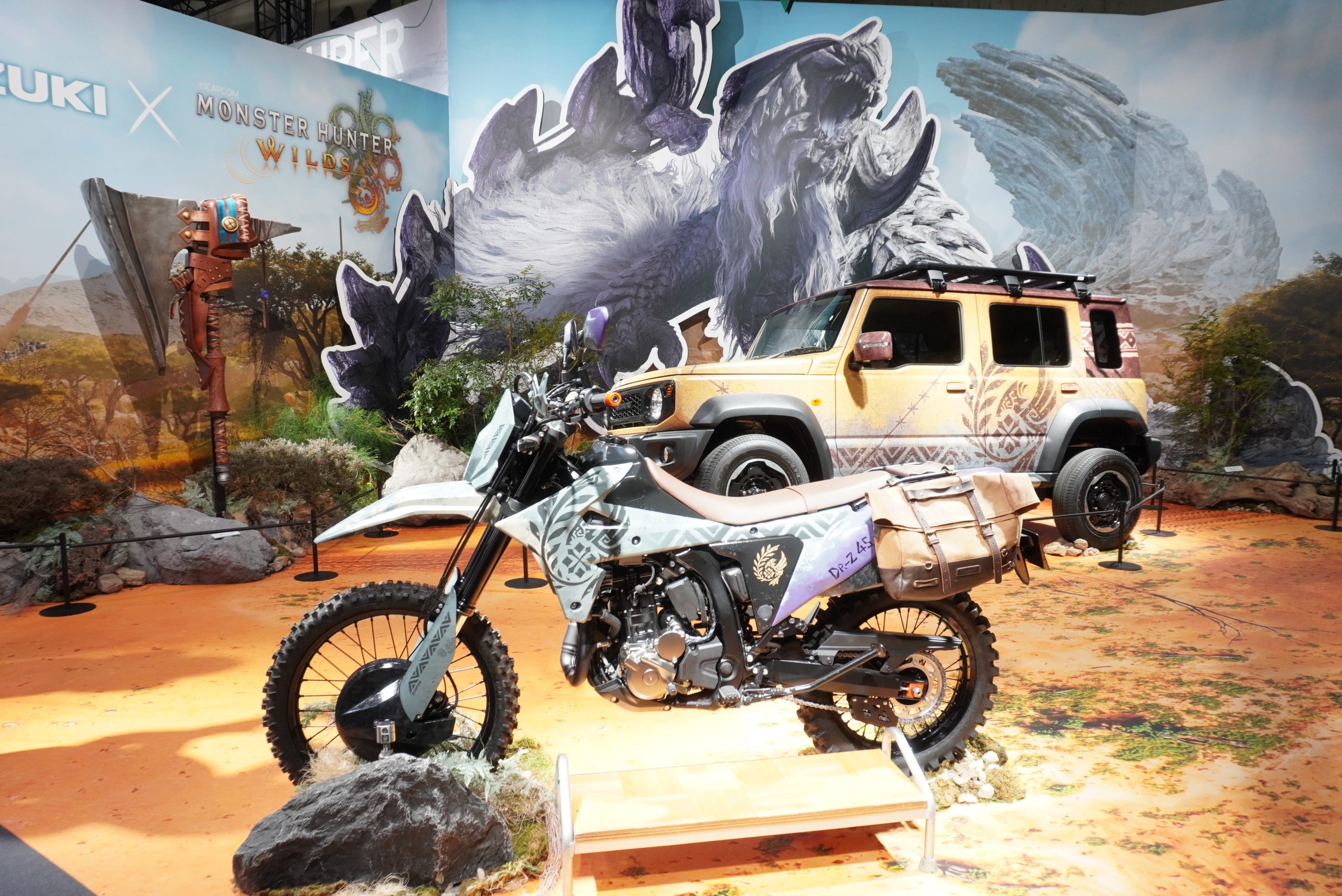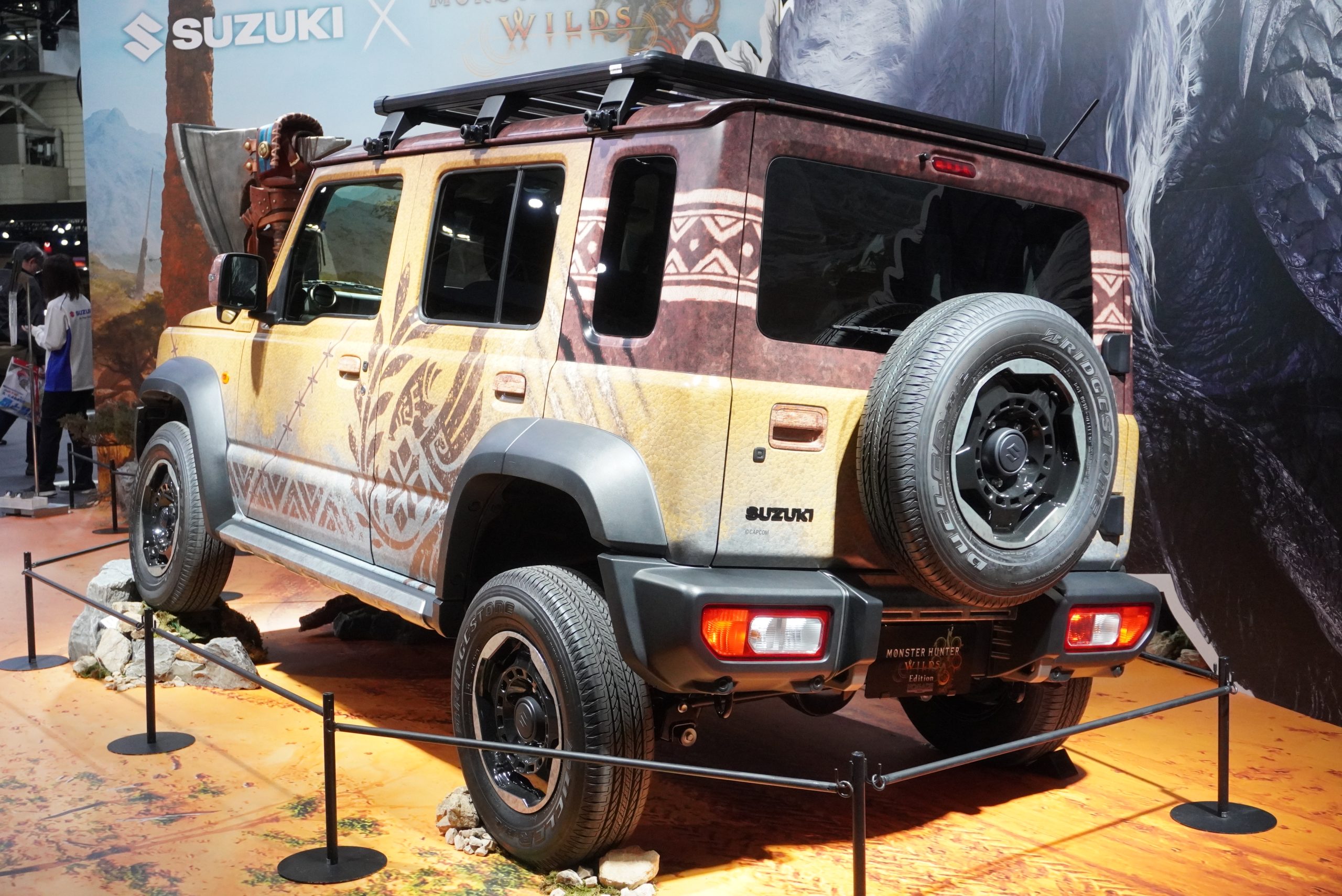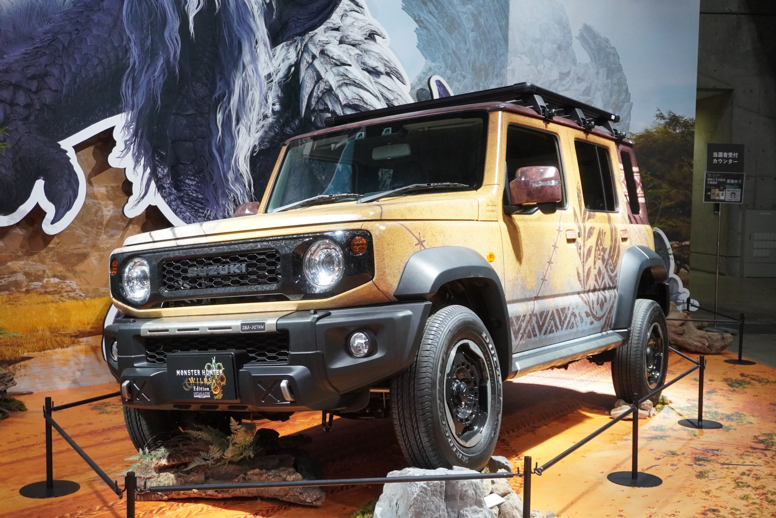 もしモンスターハンターの世界にジムニーがあったらというイメージから始まった、こちらのコンセプトカー。ゲーム内に登場する休憩所「簡易キャンプ」をイメージしたフルラッピングが施されています。ルーフとリアクォーターのブラウン部分は、実際のゲーム内のテントをイメージ。布のような生地感を表現した模様となっています。そのほかのボディ部は、ゲーム内モンスターの恐竜系を思わせる皮膚感がうまく表現されていました。