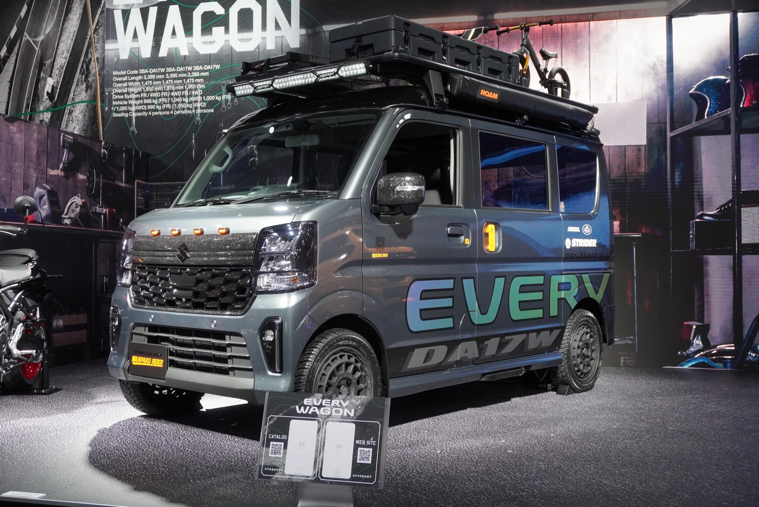 3台目は、子供のストライダーレースに夢中になってしまったパパ仕様の「エブリイワゴン」。アウトドアシーンで映えるようなパーツをチョイスしながらも、ありがちなオフロード仕様ではなくオンロード仕様に仕上がっていることもポイントです。