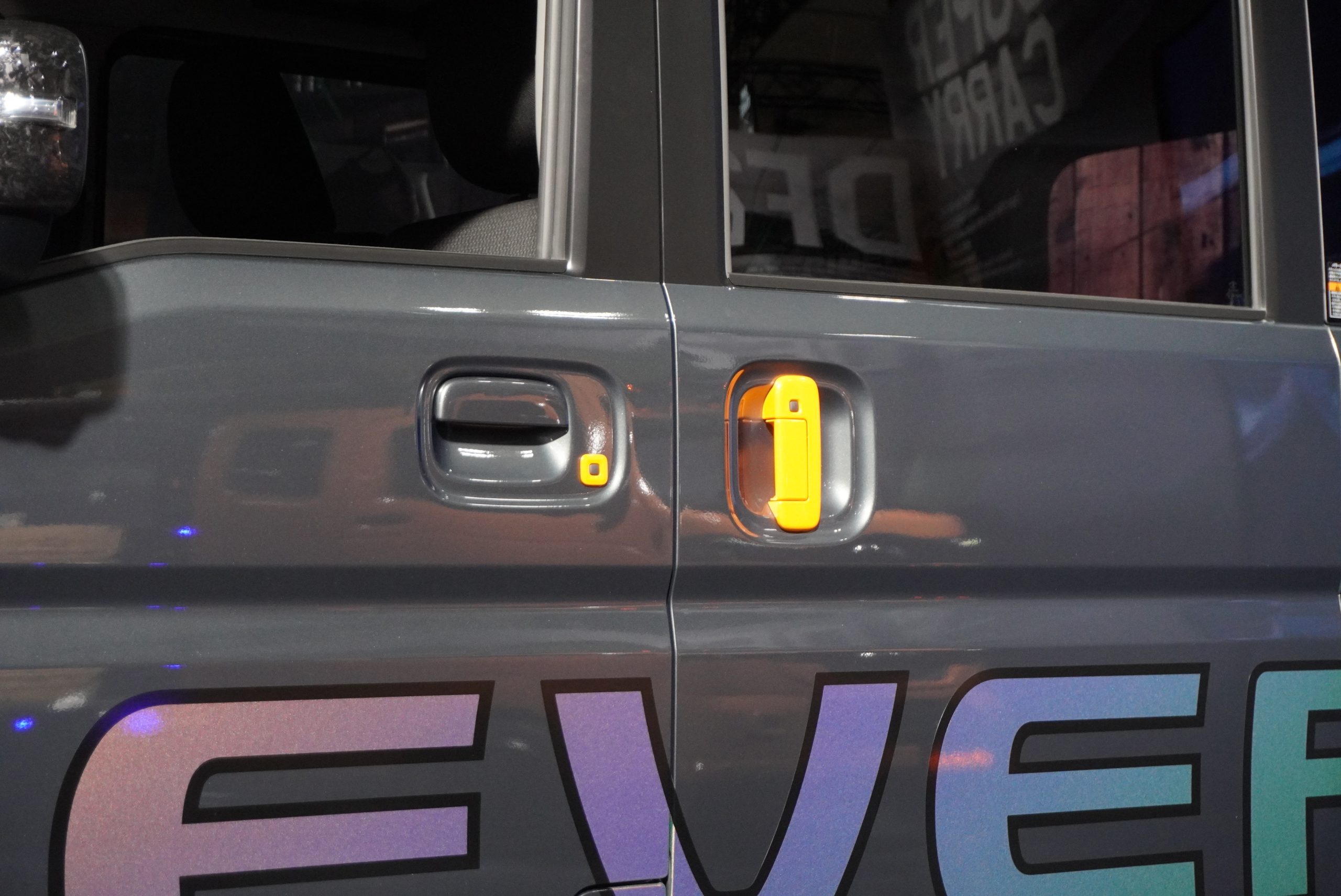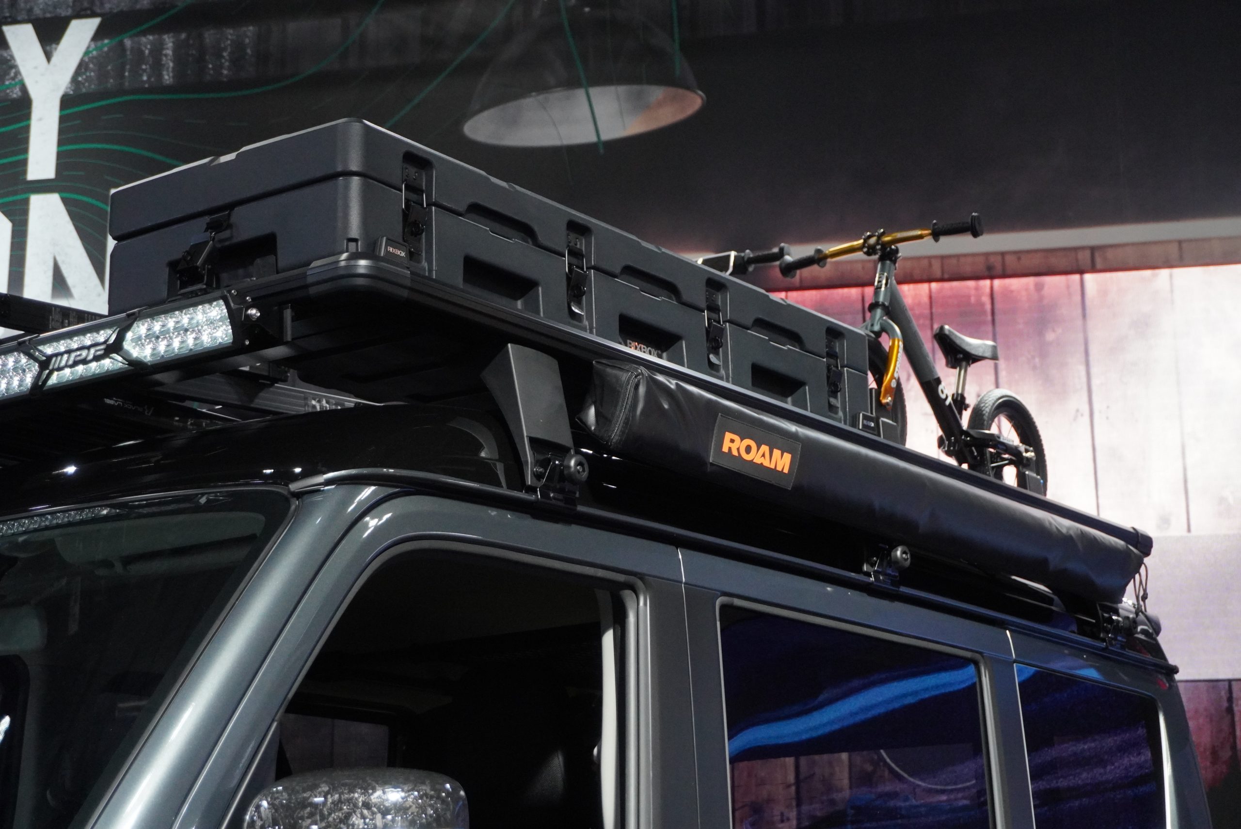 グレーとブラックの2トーンに塗り分けられたエクステリアには、やはりこの仕様だけのオリジナルパーツがふんだんに使用されています。フォージドカーボン模様のサイドミラーと、フロントグリルはカッティングシートで仕上げられ、ルーフには大型のフラットキャリアを装着。左側にはタープがつけられアウトドアでの快適性を向上させます。