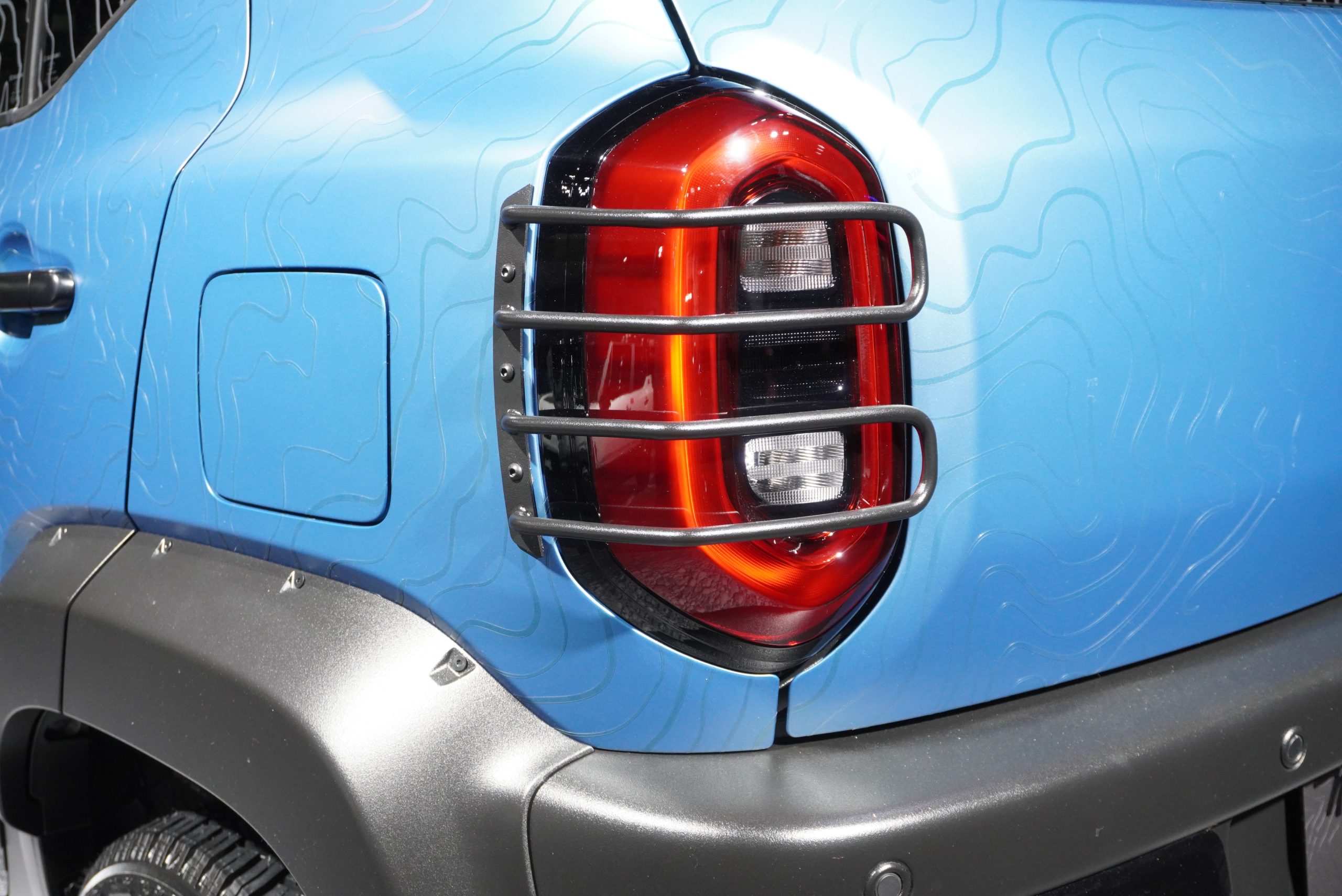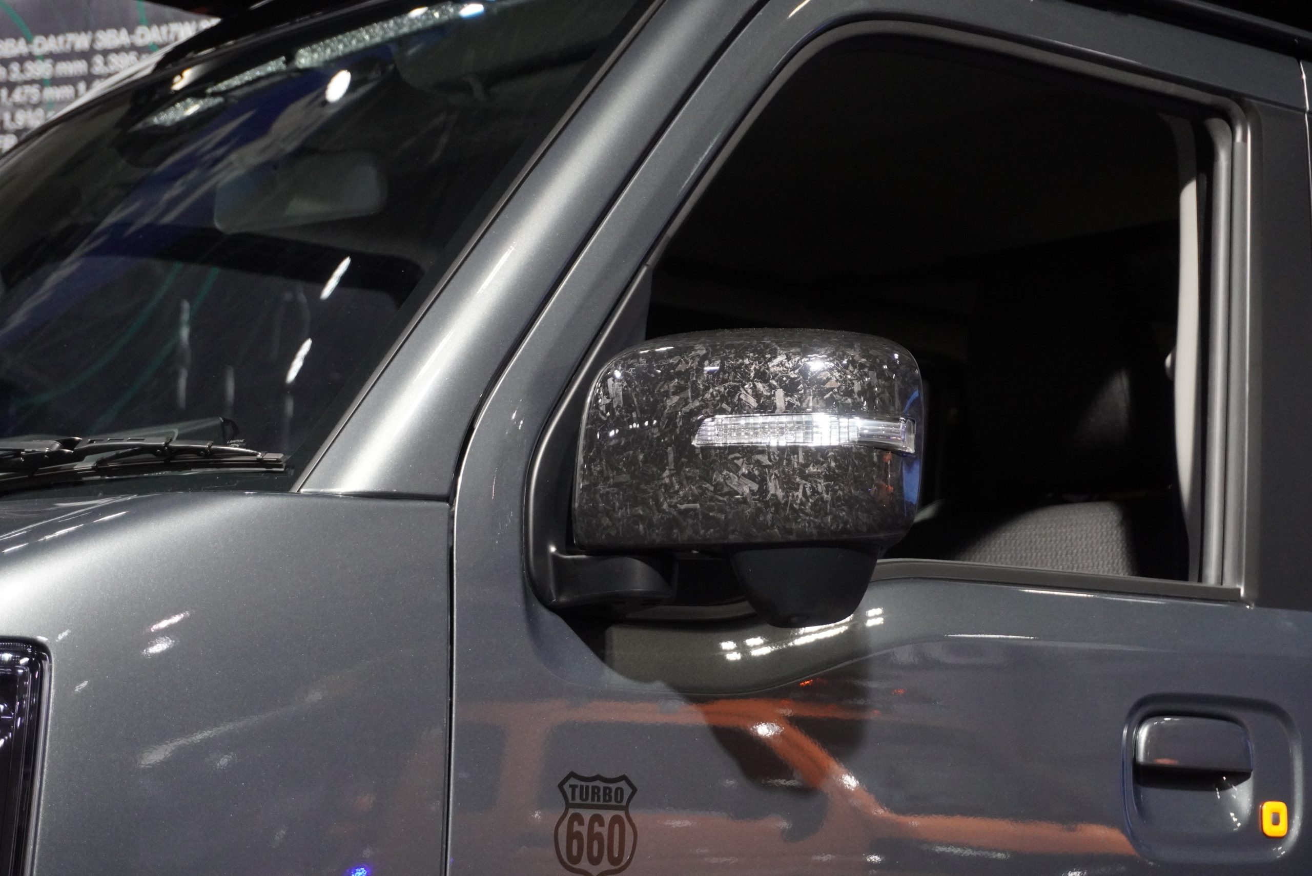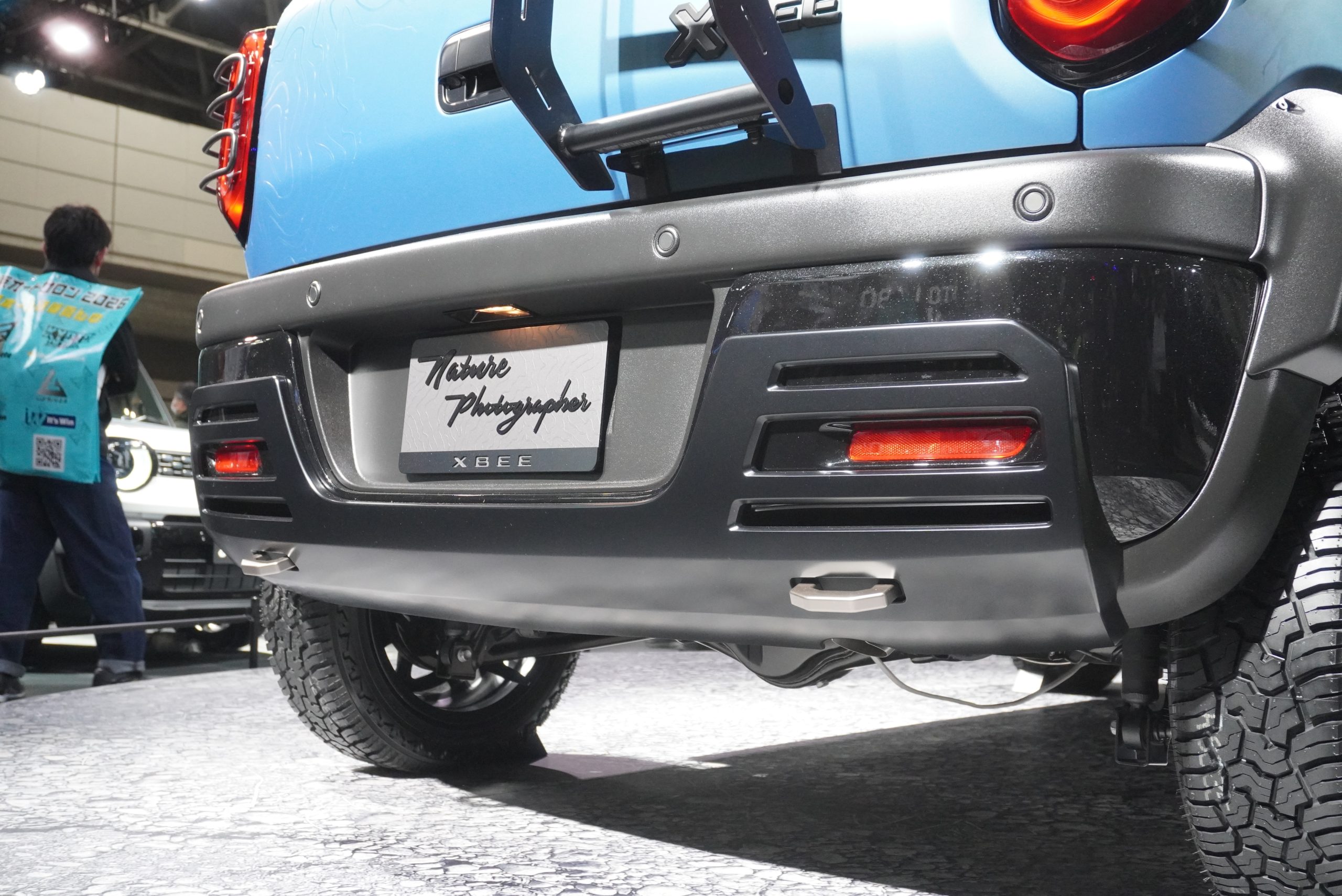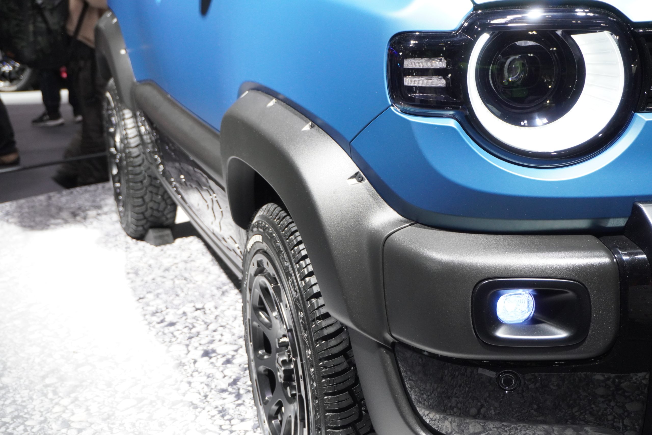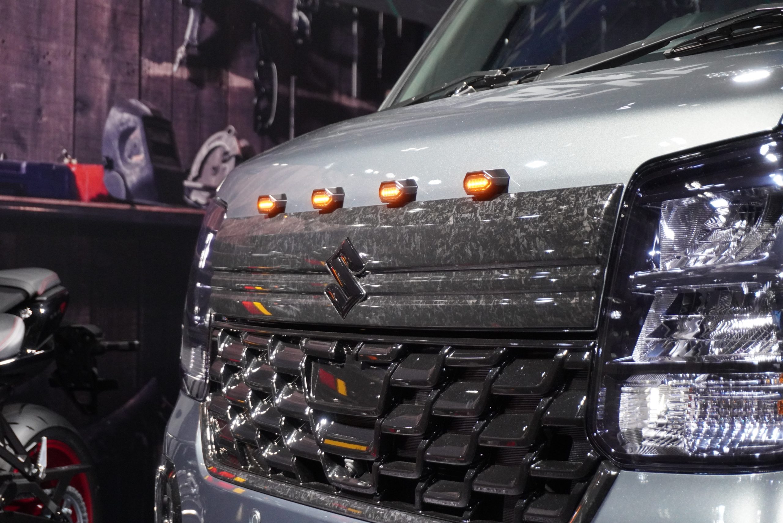 サイドシル部やホイール、フロントバンパーにはシルバーの加飾風ラッピングが施されますが、わざと汚れた風のデザインとなっているところが注目ポイント。そして、フォージドカーボン風のフロントグリルと、バンパー下部の牽引フックアクセサリーは、市販化が予定されているとのこと。ジムニーオーナー注目のドレスアップパーツといえるでしょう。