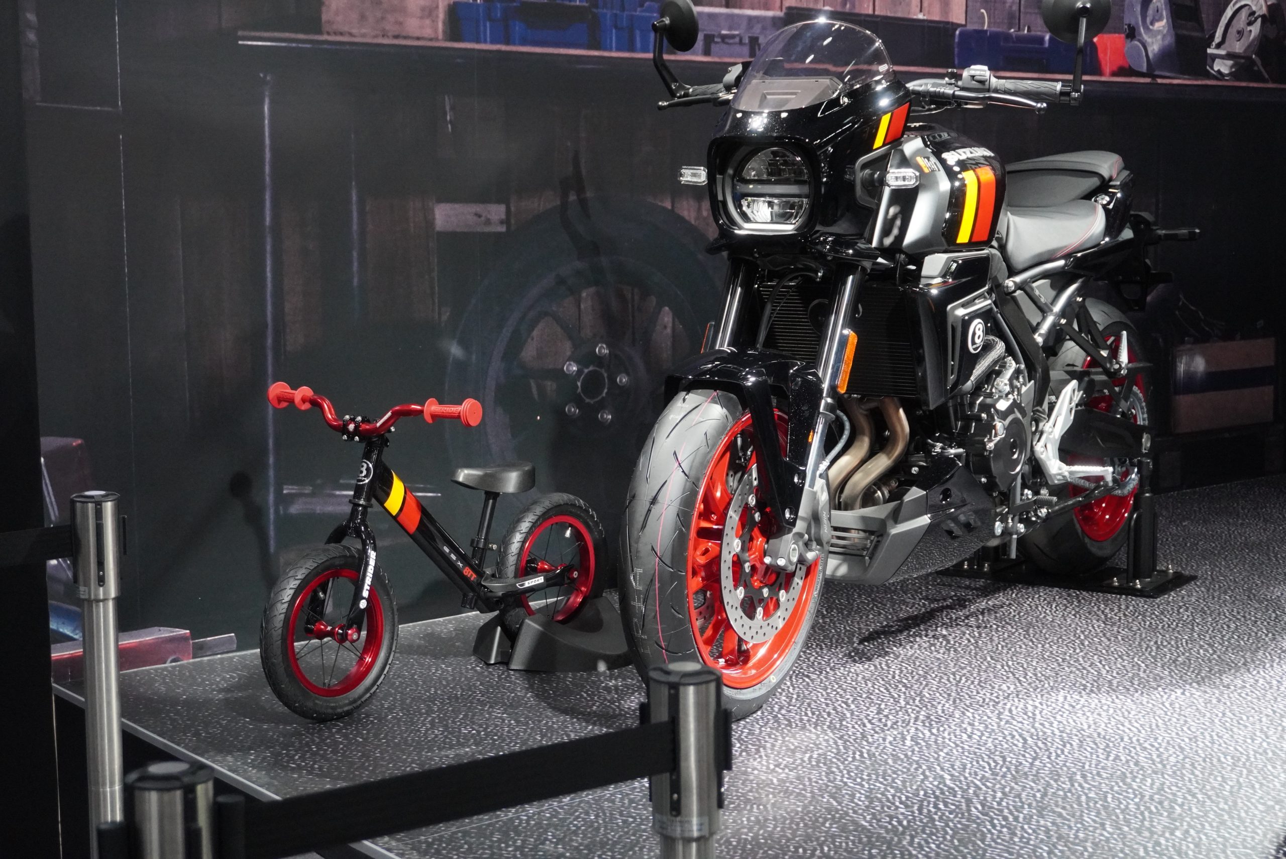 ルーフキャリアには、ストライダーが3台積載され、それぞれ2輪と4輪のスズキ車のイメージカラーに塗装されていました。特に、市販予定車の2輪ネオレトロモデル「GSX-8T/GSX-8TT」のカラーリングに塗られたストライダーは、このまま市販してもいいのではと思える出来に仕上がっています。