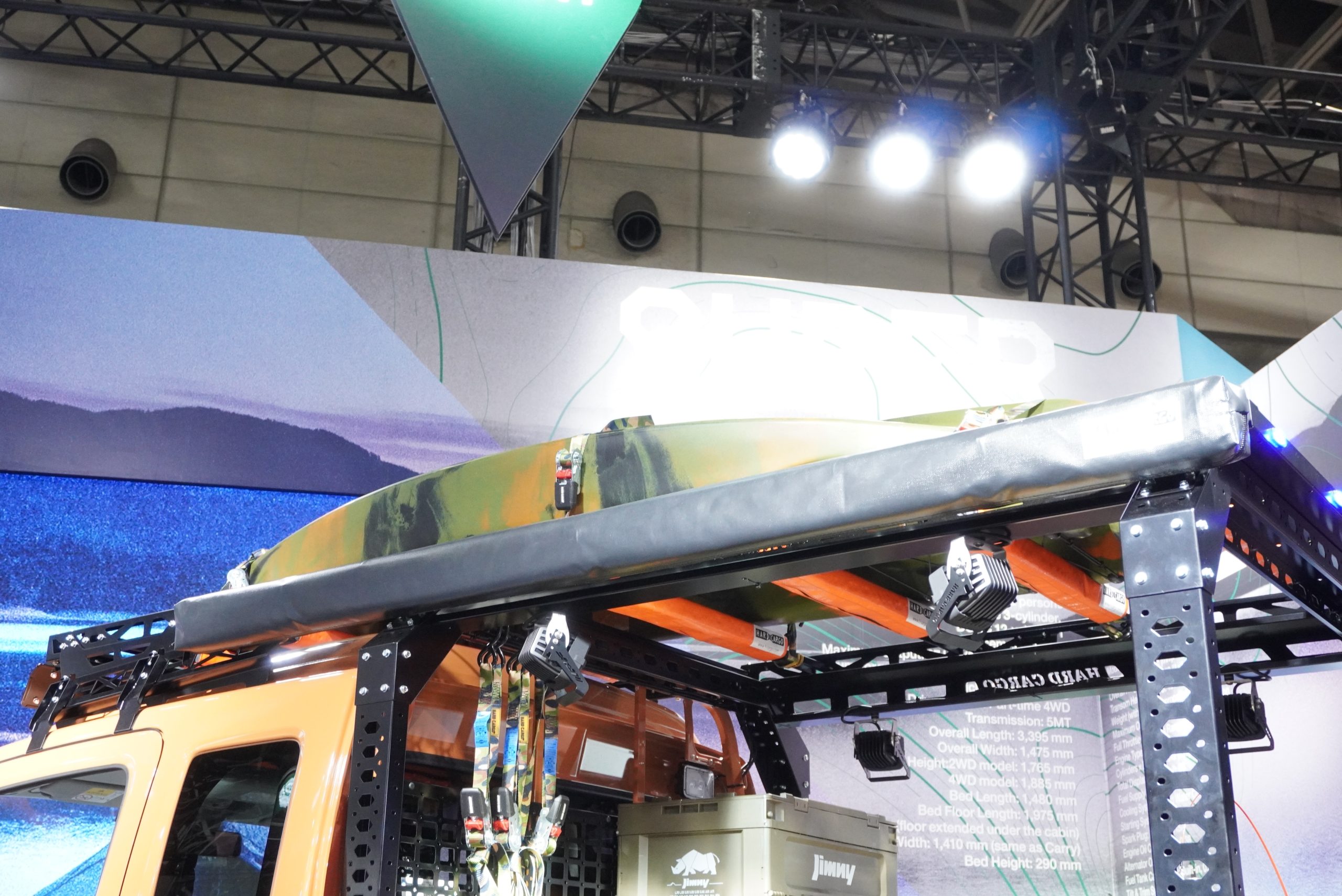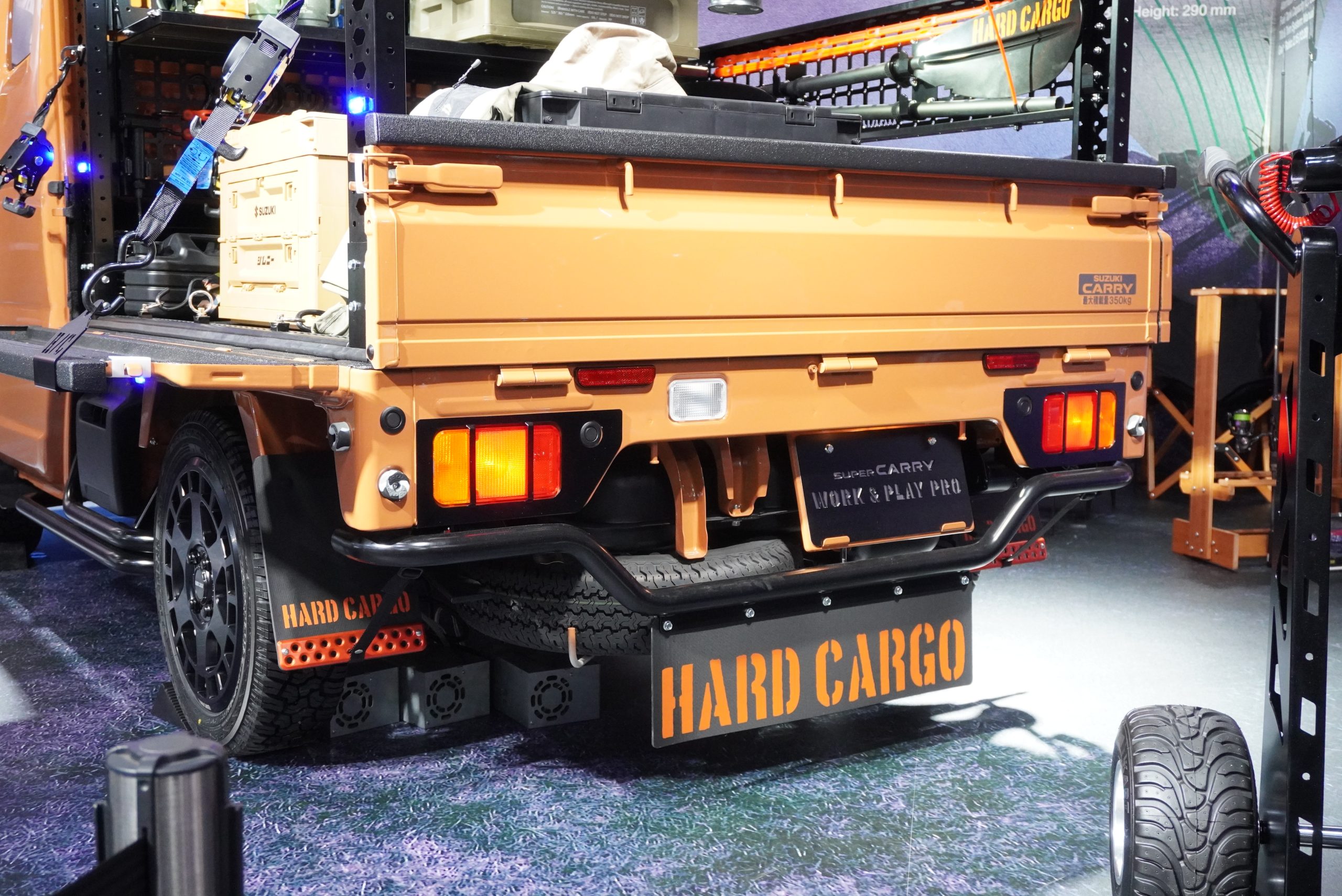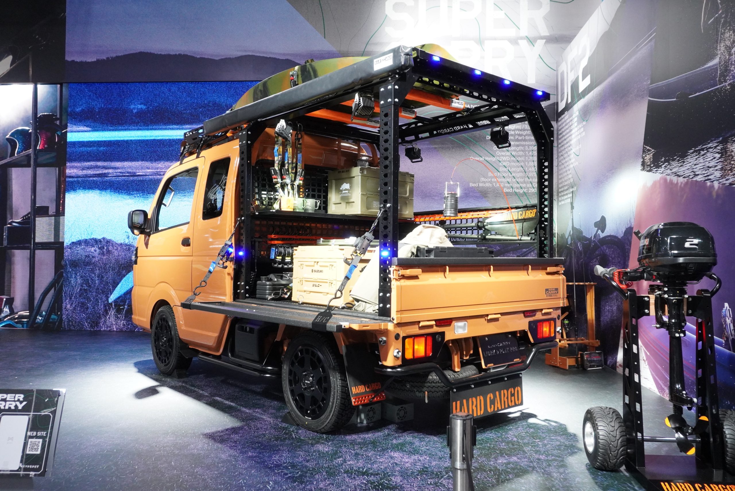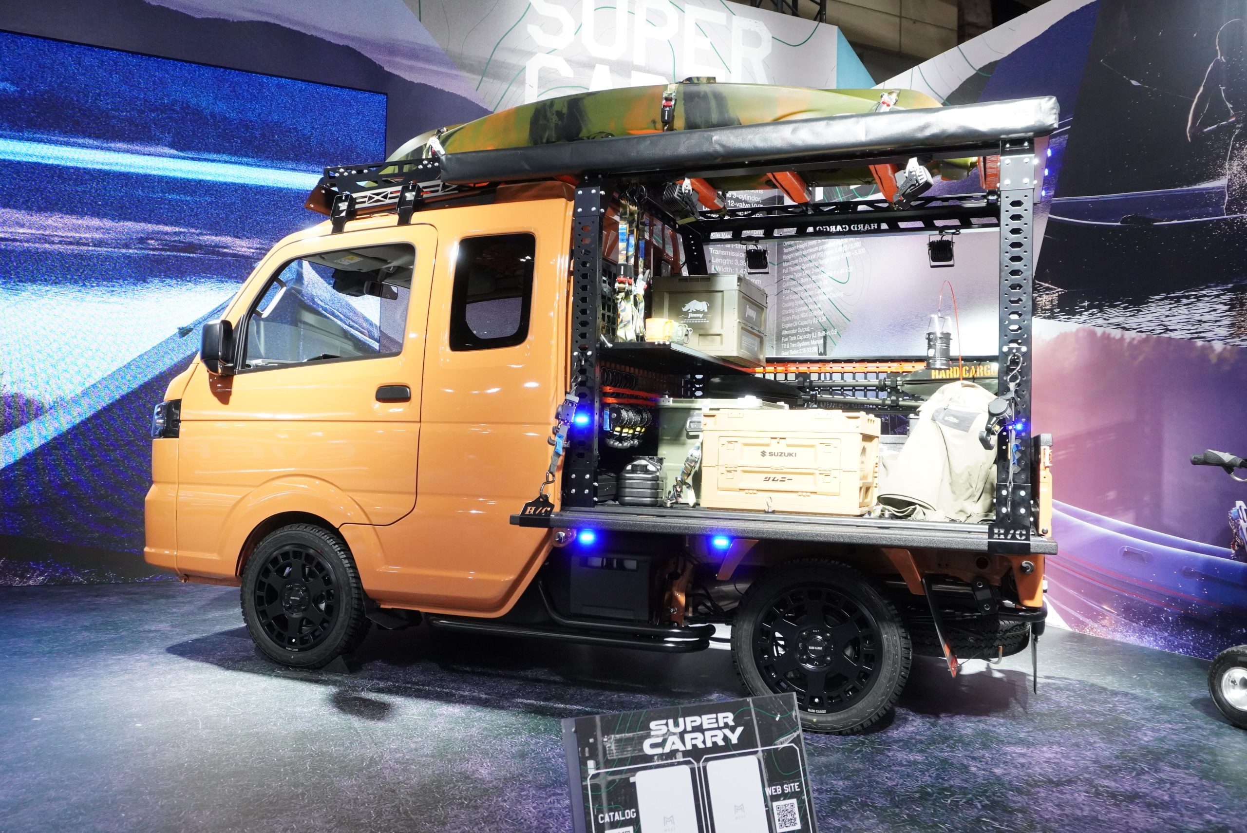 最後の4台目は、2025年12月に一部変更を発表したばかりの「スーパーキャリイ」をベースにしたカスタムコンセプト。軽トラ専門のカスタムブランド「ハードカーゴ」社とのコラボレーションでもあり、荷台にはハードカーゴ製のフレームが組まれそのままルーフにつながっています。