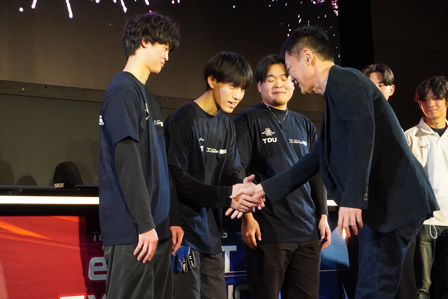 最後の表彰式にサプライズが待っていた。なんと、GTシリーズの生みの親である山内一典氏が登場。優勝した東京電機大学に優勝トロフィーを渡し、2位の駒澤大学、3位の上智大学の各メンバーと握手を交わした。