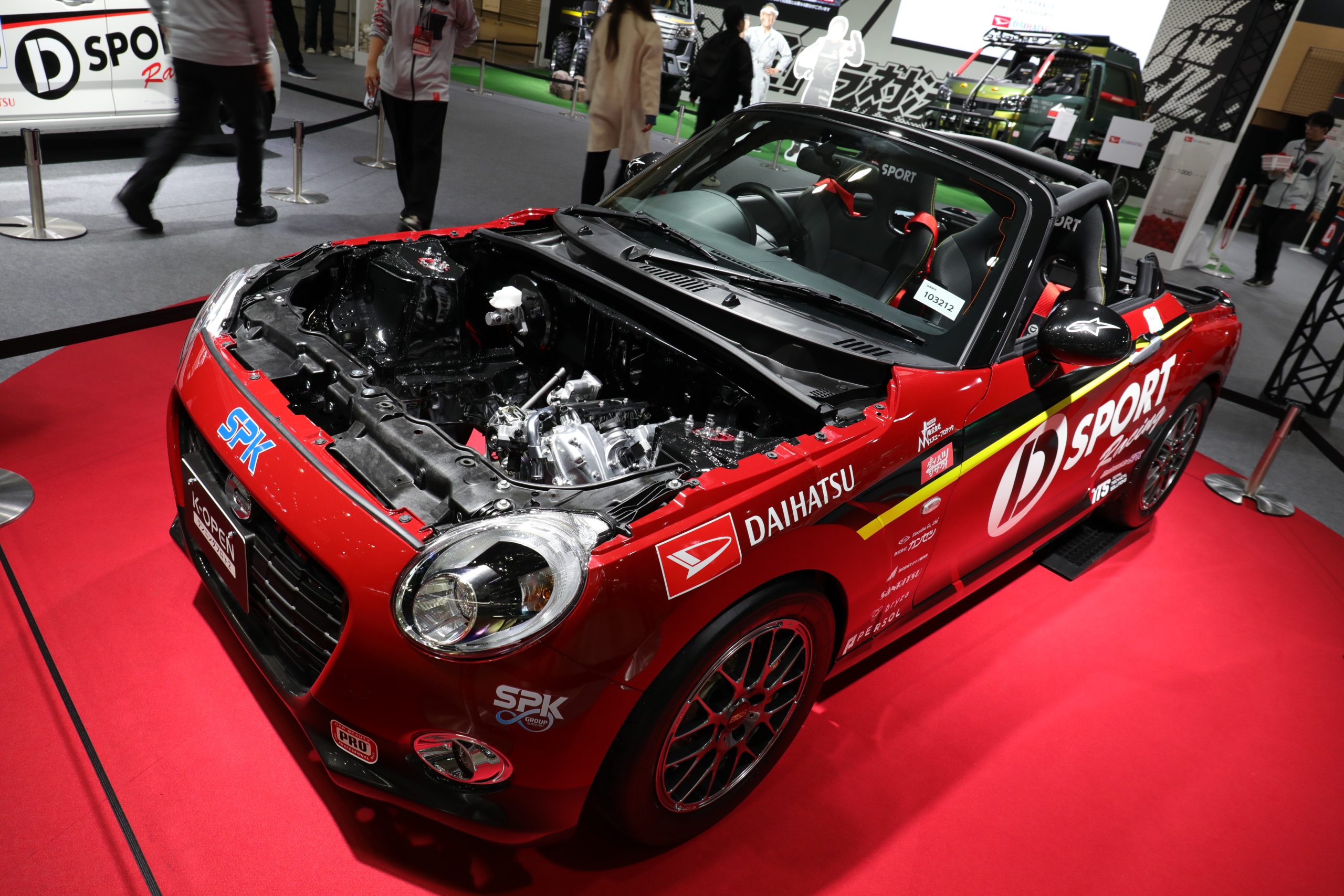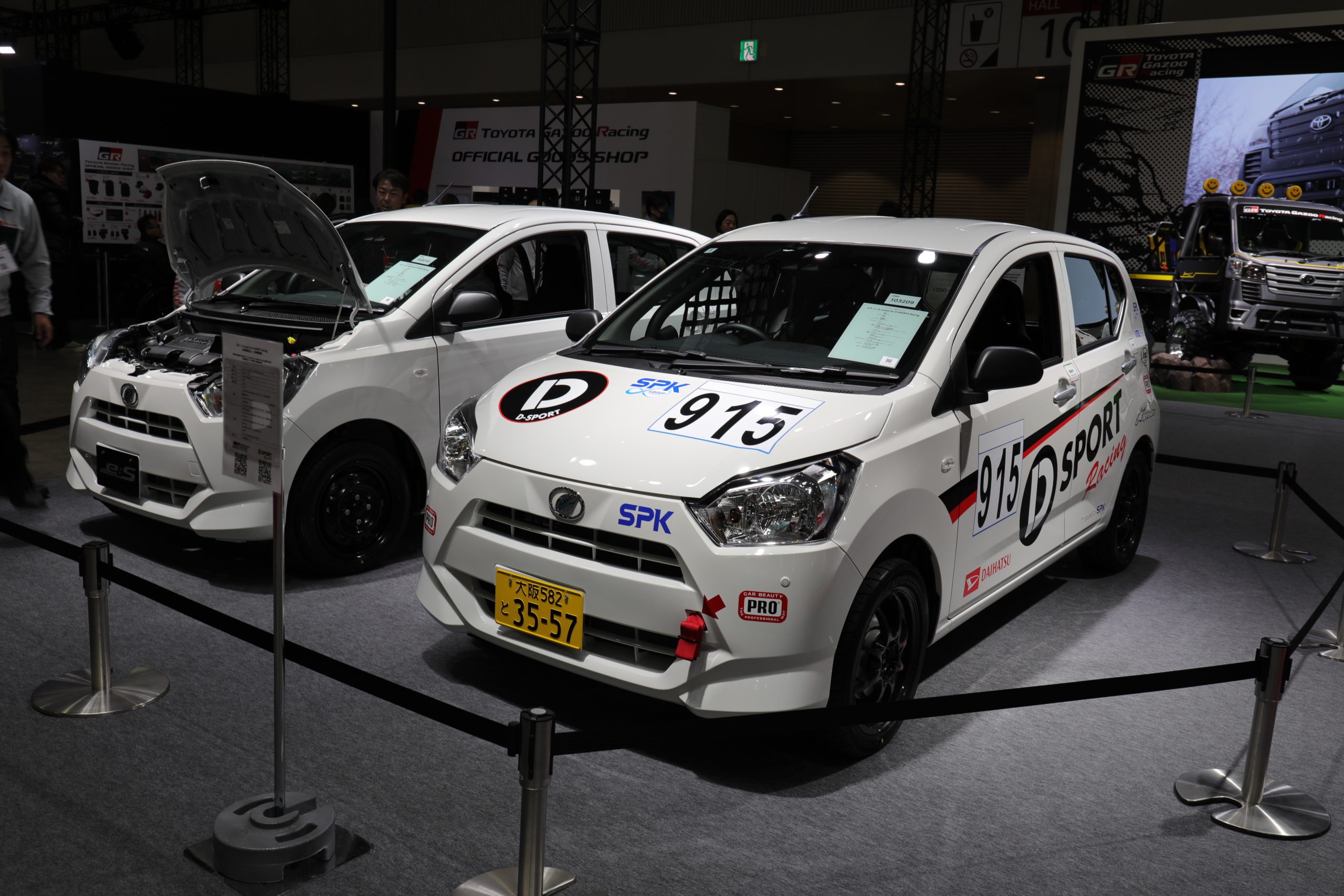 その隣に並ぶ2台の白い車輛は、SPK株式会社が市販を予定しているレースを楽しむためのコンプリートカー、「ミラ イース tuned by D-SPORT Racing」と、実際にレースに参戦した「ミラ イース 10時間耐久レース参戦車」です。コンプリートカーは、ターボエンジンと5速マニュアルミッションを搭載。6点式ロールケージも装着し、日常使用からモータースポーツを気軽に楽しむためのベーシックな素材として提案されたモデルです。