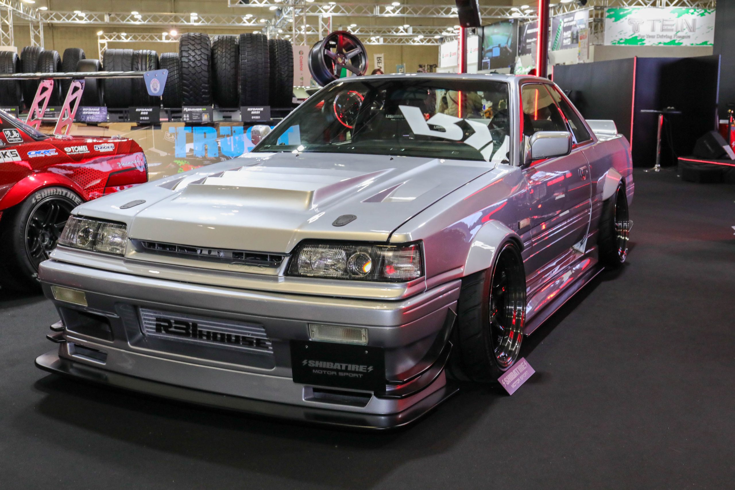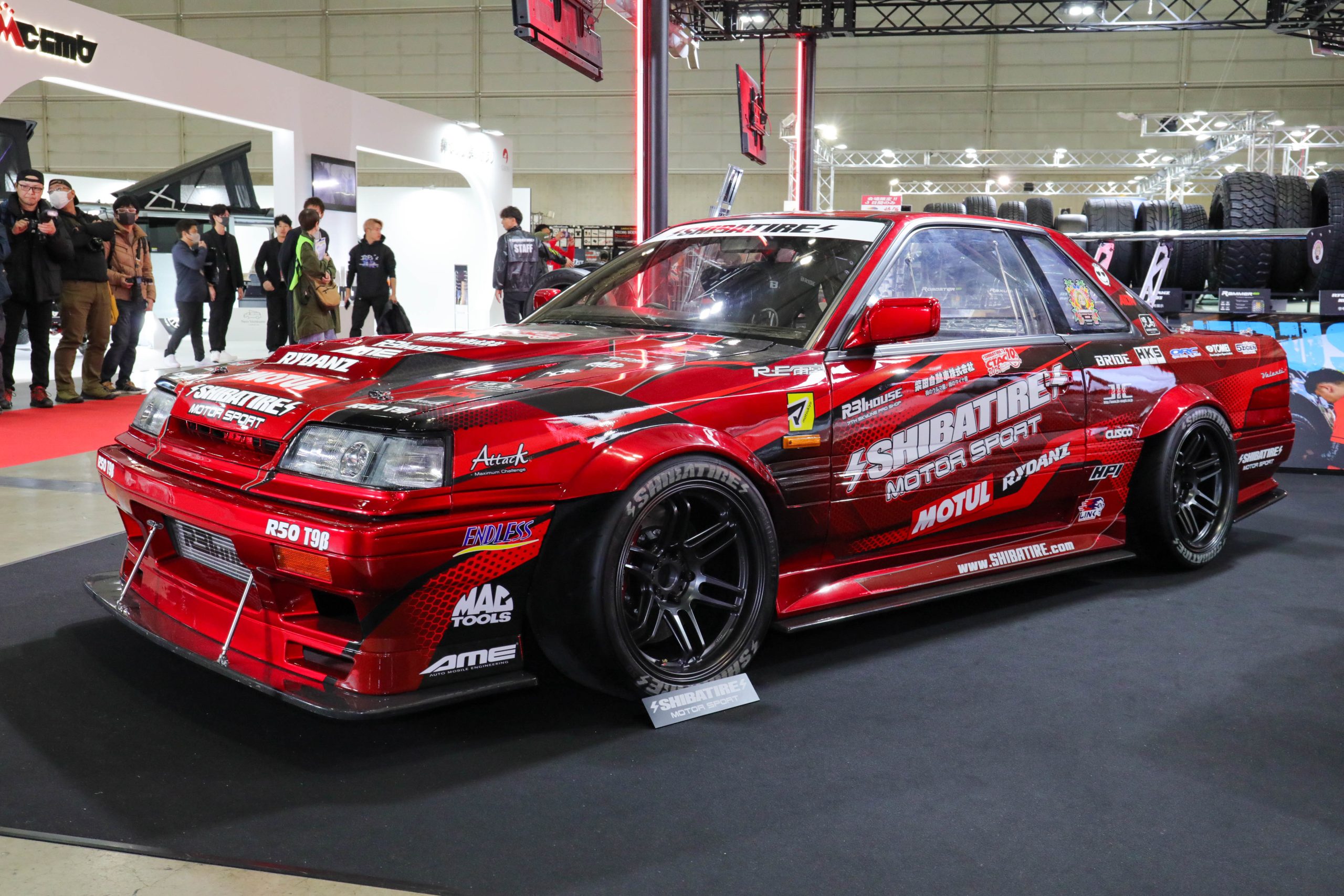 もう1台の7代目「スカイライン」は、珍しい左ハンドル仕様です。ユーザーさんの個人車輛であり、エアサス、シバタイヤ&ブリッドのコラボレーションシートなどを装着。シバタイヤの起源は、7代目「スカイライン」=R31型に特化した商品販売や車両の整備、チューニングを手掛けるR31 HOUSEというショップにあります。同店が30周年記念ということもあり、2026年のシバタイヤは、このR31型「スカイライン」がメインの車両展示となっています。