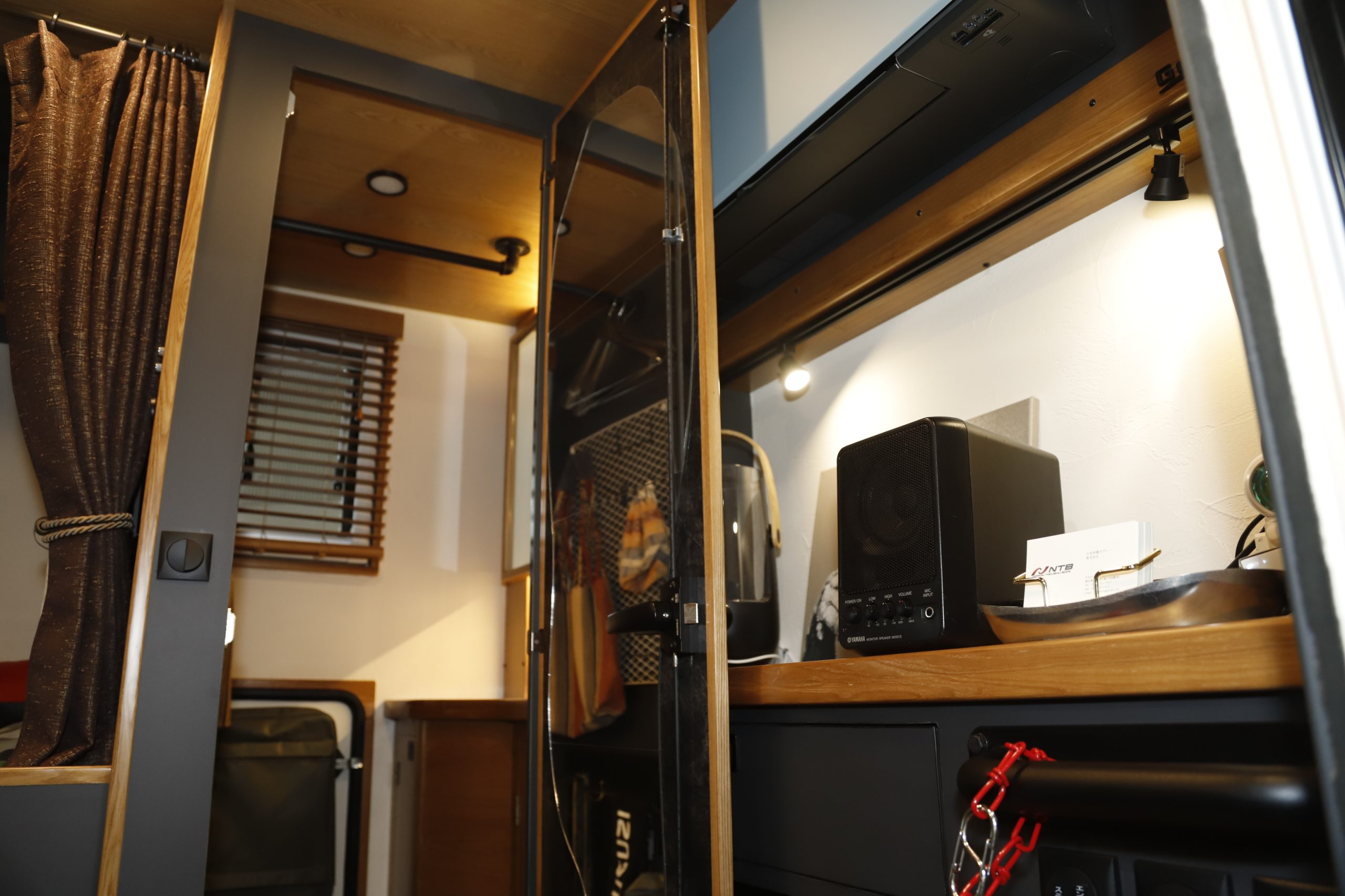 荷室側面のウィング式トビラを開くと、内部にはダウンヒルバイクのガレージをイメージしたレイアウトが登場。木目調のインテリアと、荷物の固定や棚やフックの据え付けも可能な多目的仕様となっており「バイクを運ぶだけでなく、ガレージそのものを運ぶ」という新しい提案であると解説しました。