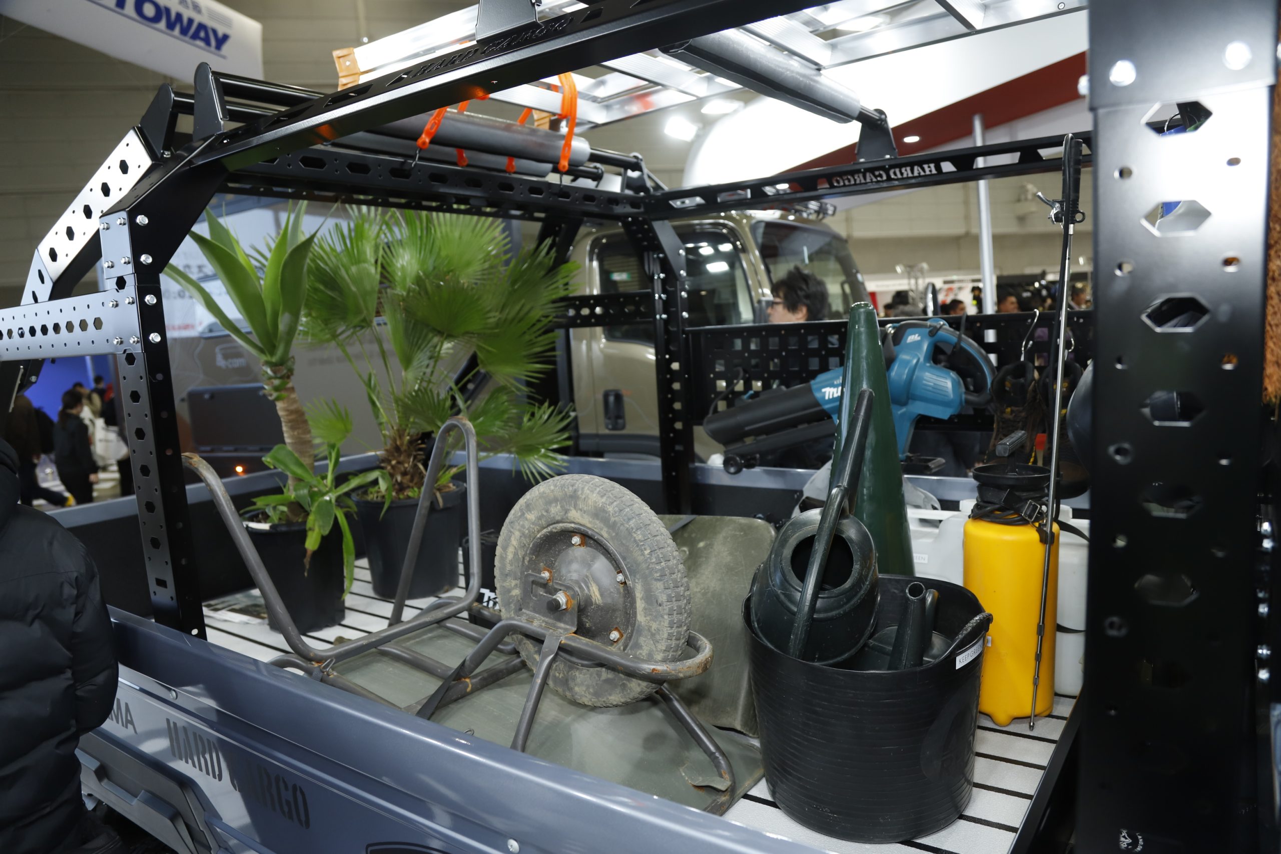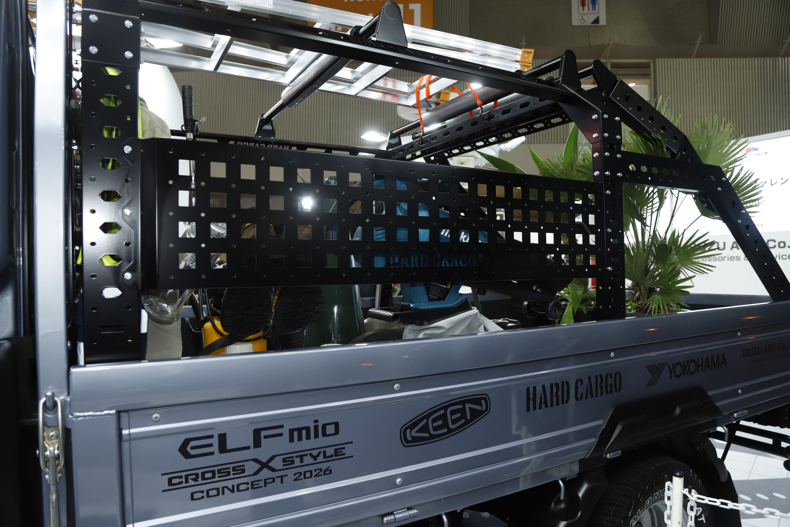 続いて「エルフミオ CROSS STYLE CONCEPT」は、現在の普通自動車免許で運転できる小型トラック・エルフミオをベースに、軽トラックのカスタムパーツを出しているハードカーゴと共同開発したワークキャリアの提案です。