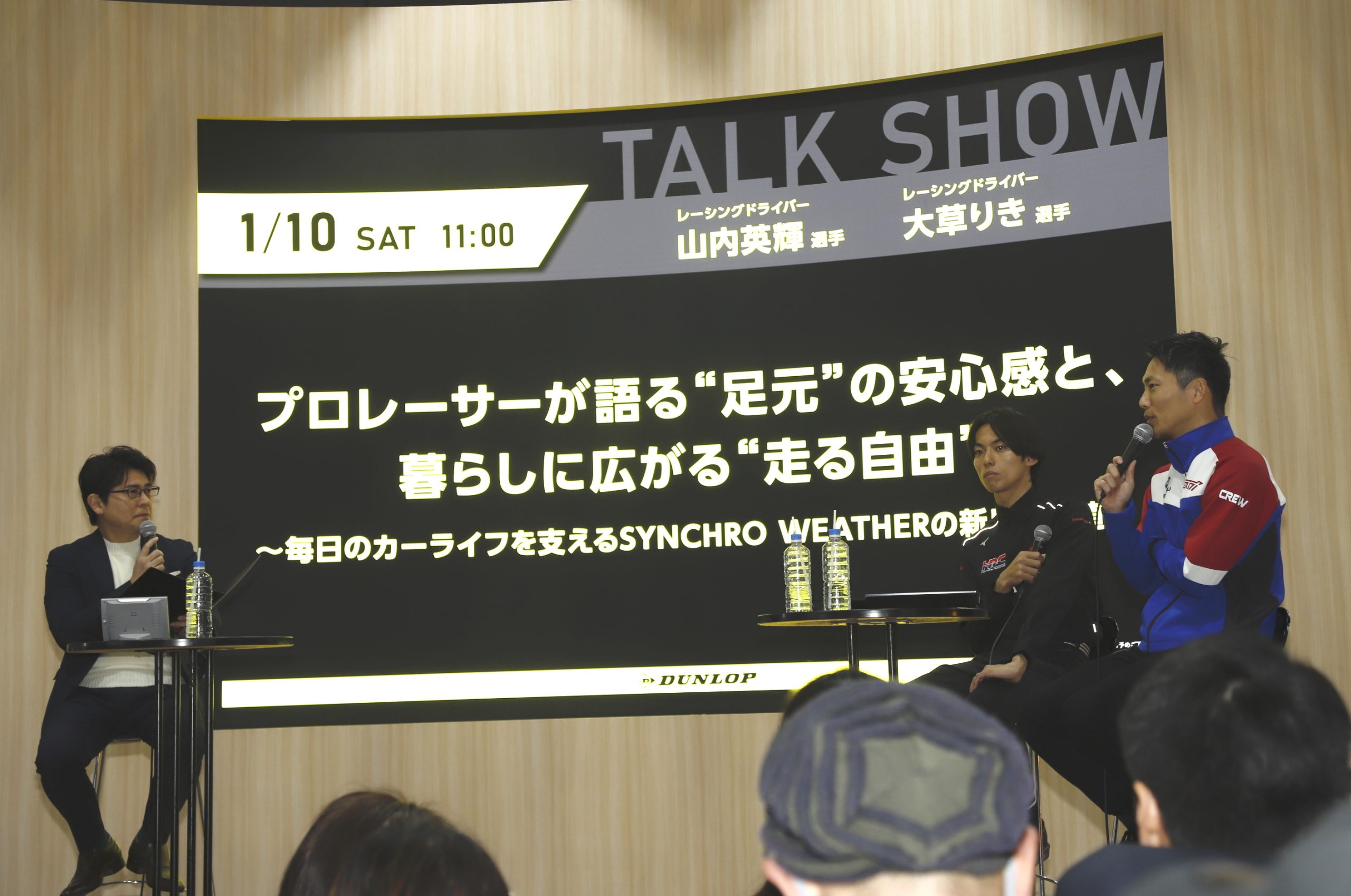タイヤ交換や保管の手間をなくし、急な天候変化にも対応できるというオールシーズンタイヤならではの安心感により、愛車との生活をもっと自由に、もっと楽しくなるライフスタイルを提案します。ブースには「シンクロウェザー」を装着した、世代を超えた国産車両が展示されるほか、DUNLOPタイヤとともにモータースポーツシーンで戦うレーシングドライバーを招いてのトークショーも行われました。