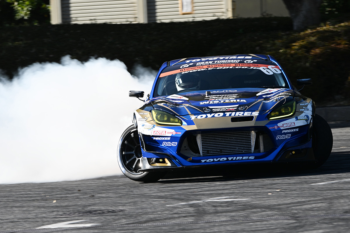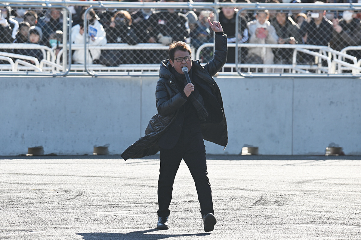 今回は大きなマシン不調もなく、10台がそろってドリフト走行を披露。大きく白煙を上げながらの大迫力のデモランは、マナPこと鈴木学さんがMCを務め、会場は大きく盛り上がりました。