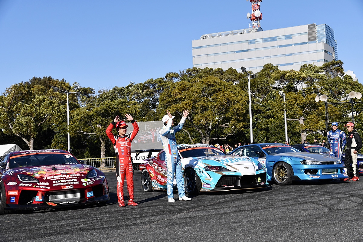 今回の「D1GP Kick Off Drift」では、2025年のD1グランプリシリーズのチャンピオンを獲得した藤野秀之選手をはじめ、蕎麦切広大選手、中村直樹選手、目桑宏次郎選手、山中真生選手、中村龍選手、和田賢志郎選手、田野結希選手、多田康治選手、玉城詩菜選手の10名、そして10台のD1マシンが出演しました。