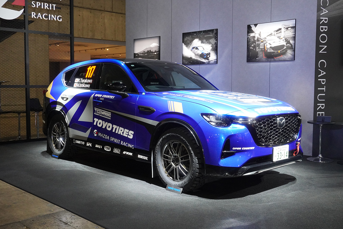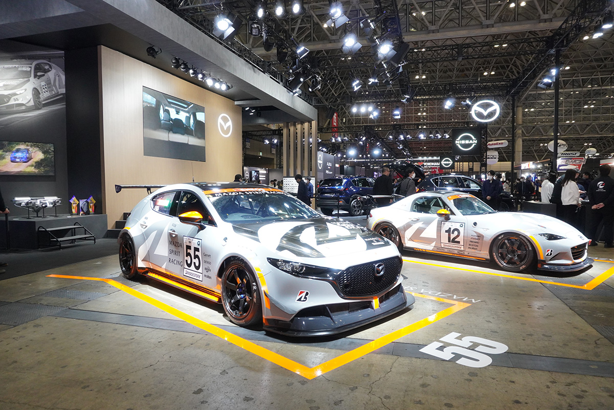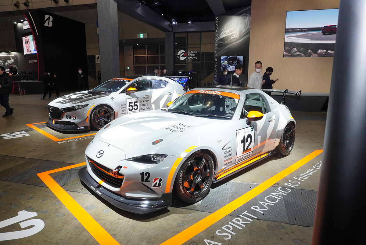 マツダのブースでは、スーパー耐久に参戦中のレーシングコンセプトの2台が出迎えてくれました。マツダスピリットレーシングのロードスターとマツダ3、そしてその奥には2025年のラリー北海道をクラス2位で完走した、CX-60のラリーカーも展示してあります。