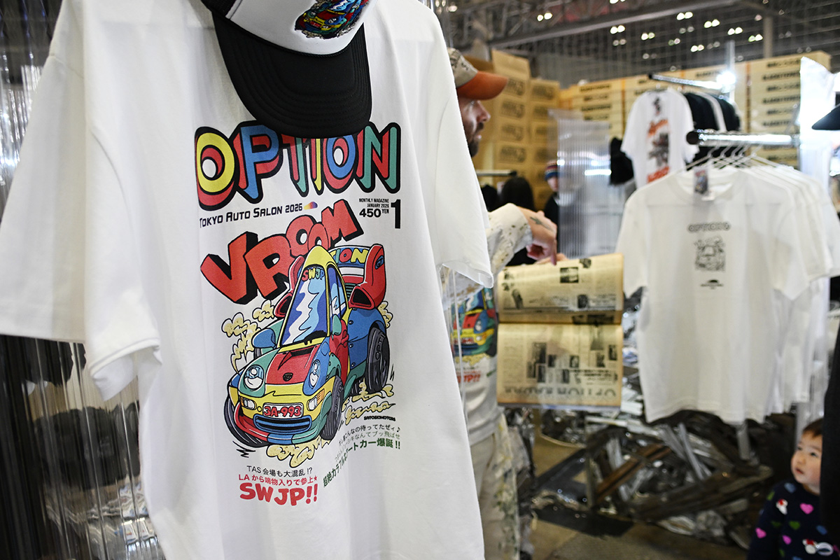 SWJPは、1981年創刊のクルマ雑誌「OPTION(オプション)」と、BlackEyePatchは、連載30周年を迎えた漫画「頭文字D」と、JDMtoursは、その「頭文字D」と「Video OPTION」と、という具合に3ブランドそれぞれがコラボレーションアイテムをお披露目しています。