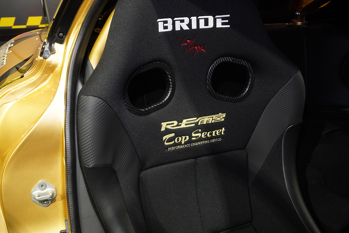 ベース車がRX-7というだけあり、RE雨宮の色がより濃く反映されているTHE SEC“RE”T 7。3ローター/320馬力の20B型ロータリーに、RX-8用の6速MTが組み合わせられ、吸排気系もRE雨宮オリジナル。エアロパーツも含めほぼRE雨宮仕様と思いきや、ブレーキシステムにR35 GT-R用が流用されていたり、ボディカラーがゴールドで仕上げられていたりと、トップシークレットの技術もしっかりと導入されていることがわかる。
