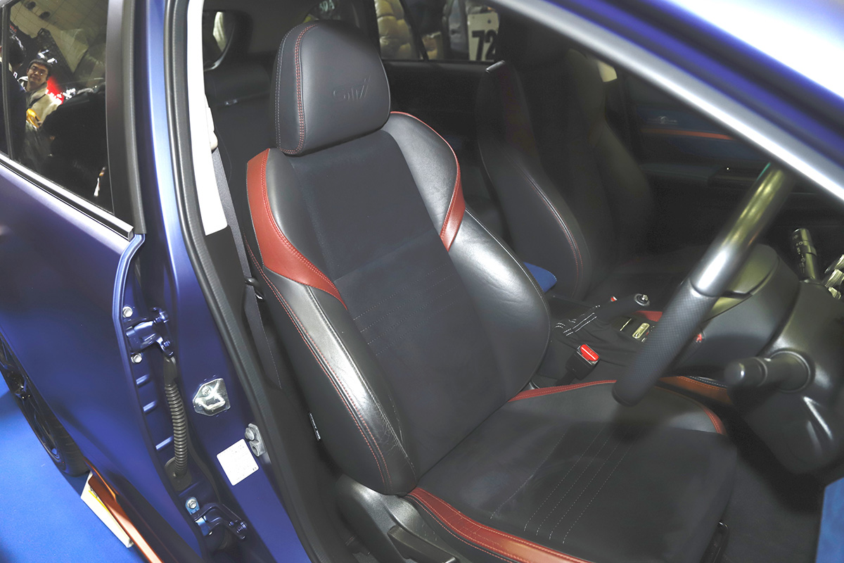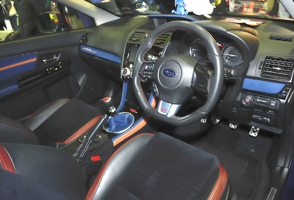 インテリアも純正らしさを残した仕上がりですが、なんといっても6速MTのシフトノブがインパクト大。シートも一見するとWRX STI純正ですが、じつはシートフレームはレヴォーグ純正を残りながら、WRX STIのシート表皮に交換という手が込んだもの。これはWRX STIが電動シートを装備しているのに対し、レヴォーグは手動であったためそのまま換装することができなかったからだとか。