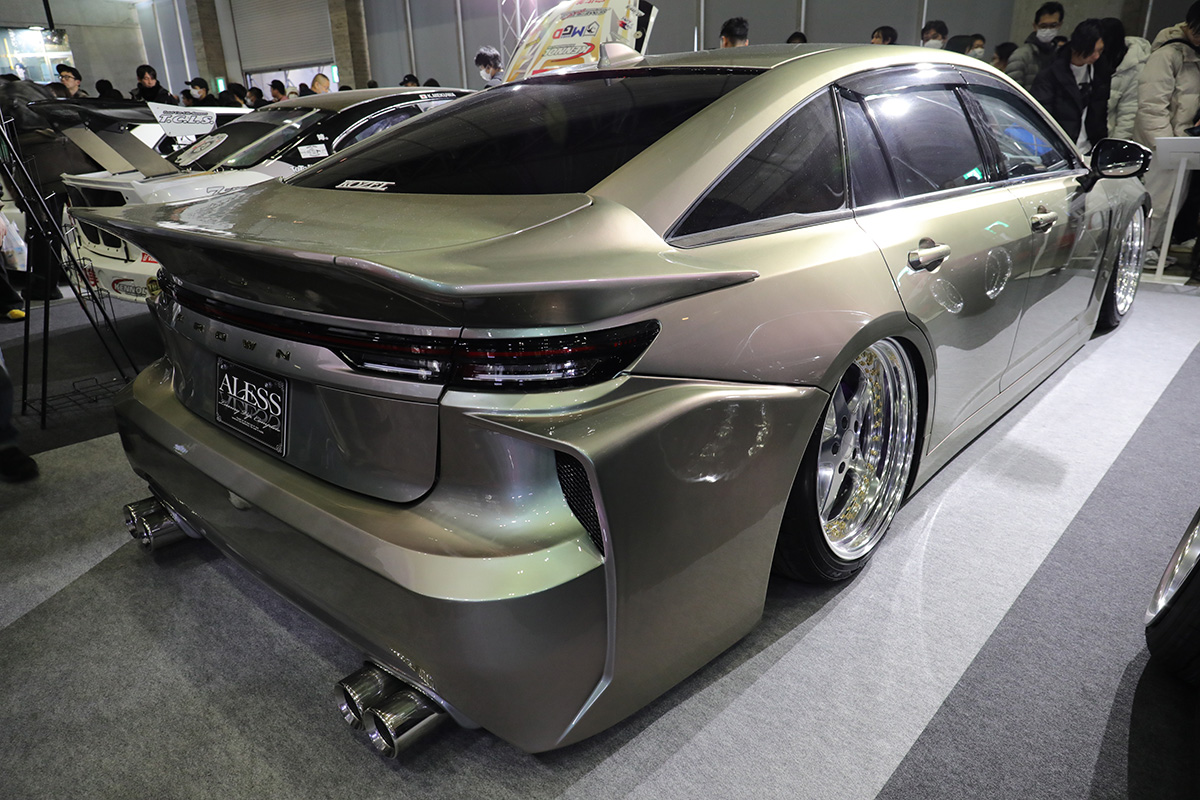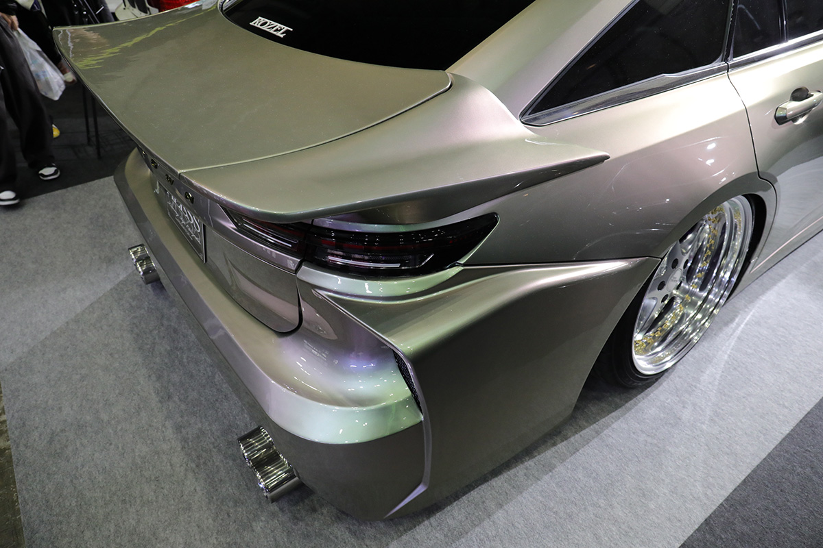 「デザインを考えるうえで、最初に考えたのは真横のシルエットです。セダンらしくするために、リアには昔ながらのトランクのようなデザインが欲しいというのがきっかけでした」と上山さん。大胆なリアウイングは、往年のVIPセダンで愛用された当時らしい雰囲気を踏襲。それに合わせて、バンパー各部をワイド&ロングに。ただし、純正ボディが持つラインは意識して造形されているのが特徴です。
