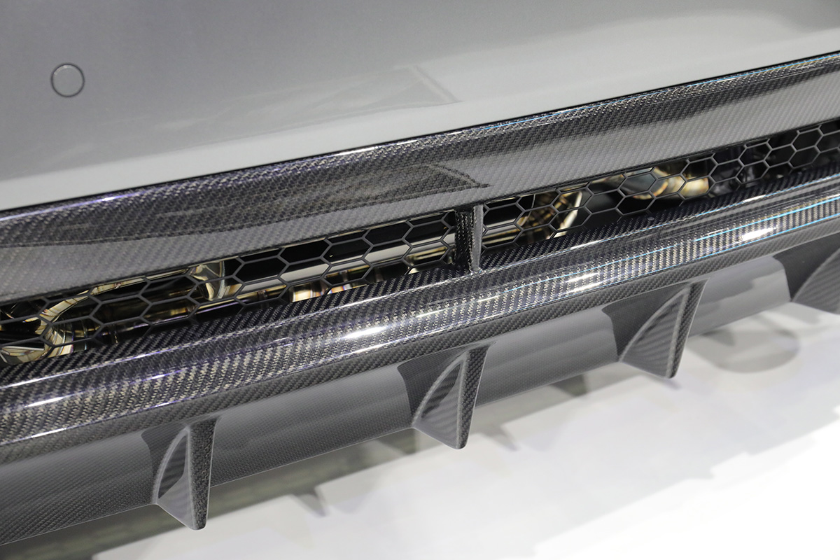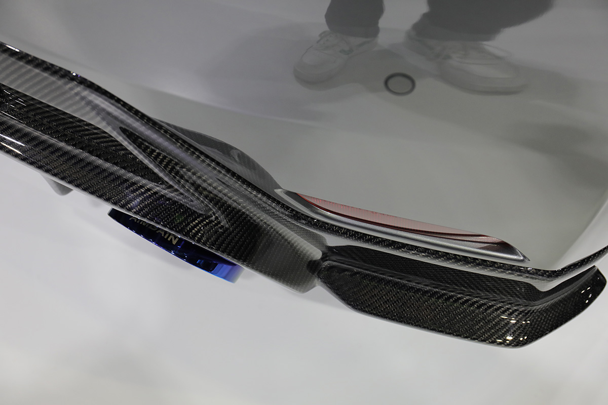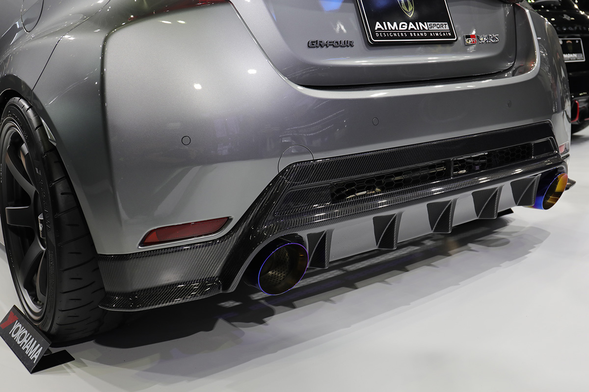 AIMGAINの造形美は、各部に表現されています。例えば、リアディフューザーと同社オリジナルマフラーとの絶妙な配置。リアのメッシュは、純正よりも高い位置にデザインしたことで、バンパーの内部が透けてみえる構造になっており、同社のこだわりを強く感じることができるポイントです。