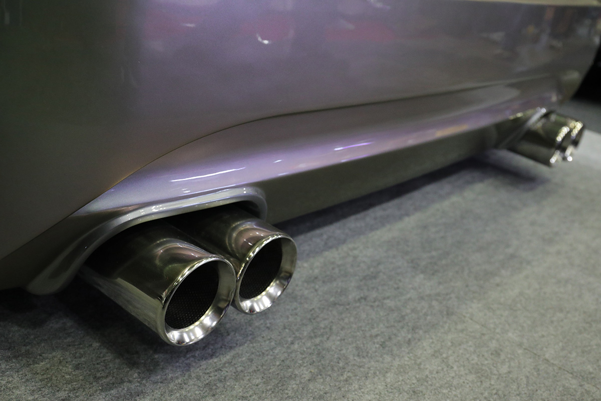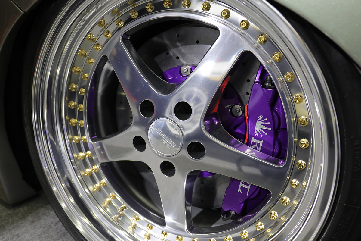 ROZELとしては、エアロパーツだけではなく、エアーサスペンション、ホイール、マフラーなどもオリジナル商品として販売しています。ホイールは、FEARLESSという商品で、装着サイズは前後 20インチ、フロント10J、リア11J。サスペンションも同社のエアーサスペンションを使用。そして、ディスクローターはカーボン製ドリルドタイプで、これも絶賛発売中。迫力のデュアル4本出しマフラーも、オリジナル品となります。