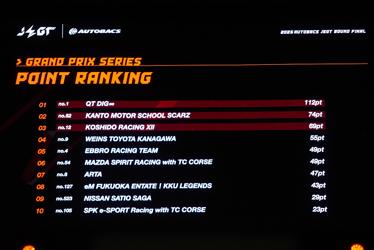 毎年東京オートサロンで行われる最終戦は年間のシリーズチャンピオン決定戦となる場合が多く、今回も例に漏れず。ポイントリーダーである「QT DIG∞(旧Sengoku Gaming)」が4連覇を達成するかに注目が集まりました。