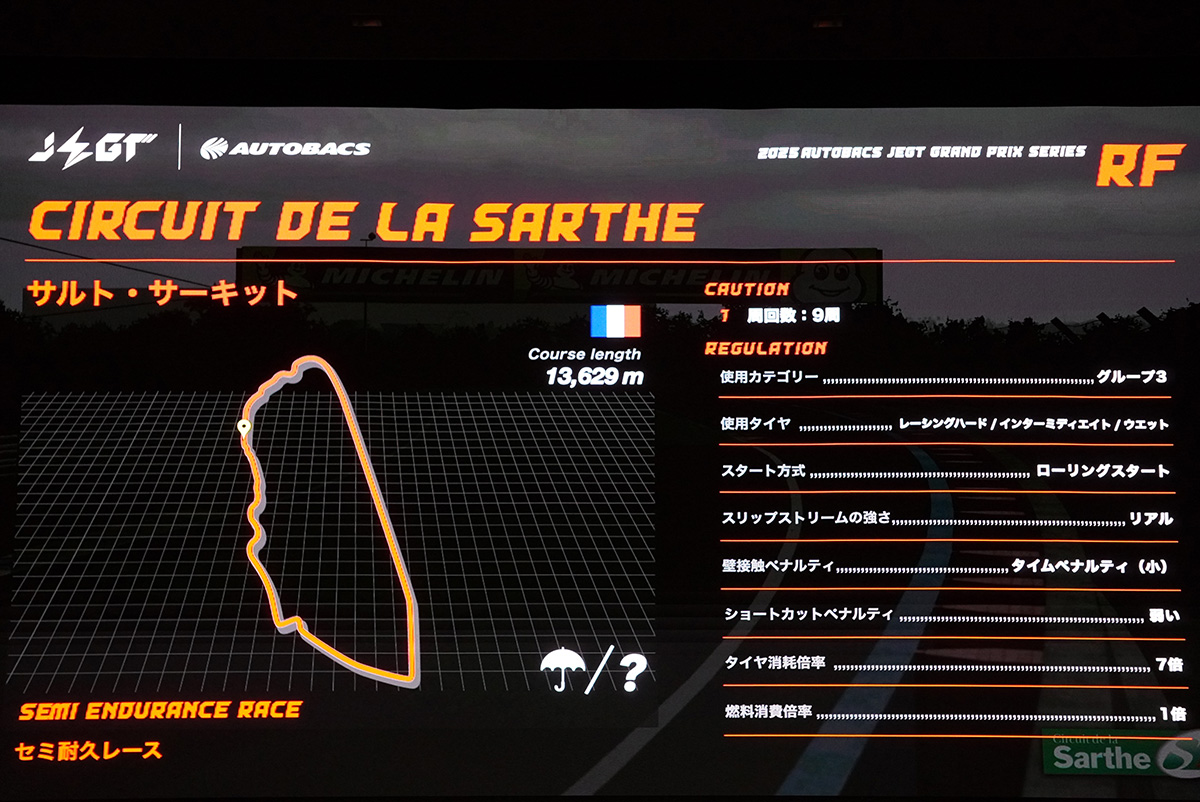 決戦の舞台はル・マン24時間レースでお馴染みの、サルト・サーキット。13kmのコースを9周するセミ耐久形式で行われました。ピット1回とドライバー交代が義務付けられ、給油とタイヤ交換は任意というルール。ピット戦略も勝敗を分ける要素となる、本格的なレース形式となりました。