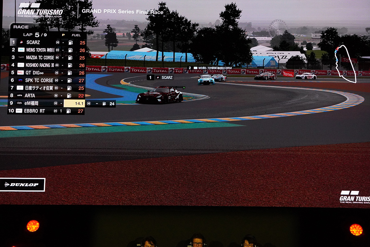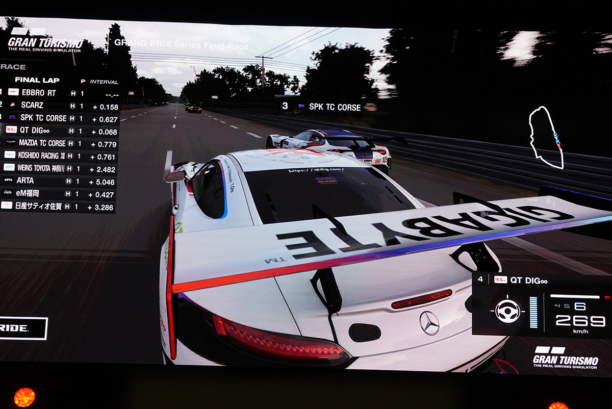 勝負はファイナルラップでもトップがコロコロ入れ替わる、息を呑む展開に。ギャラリーの盛り上がりが最高潮に達したのは、名物のロングストレート「ユノディエール」を過ぎ、数コーナー過ぎたあたりでした。それまでトップを争っていた「KANTO MOTOR SCHOOL SCARZ」と「EBBRO RACING TEAM」が接近戦を繰り広げる中で接触。コースアウトを喫してしまいます。ここまで3位と4位を走っていた「SPK e-SPORT Racing」とQT DIG∞が、代わって首位争いをする展開となるだろうと誰もが思っていました。