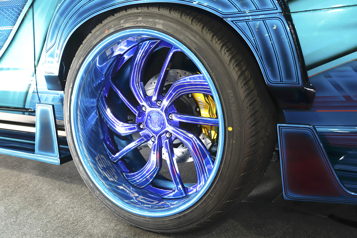 ボディはオリジナルのエアロブランド「FANG ARMOR」によるワイドボディキットで、フロント/サイド/リアのアンダースポイラーを装着。さらに前後のオーバーフェンダーにより、さらに迫力を増しています。サシペンションおよびブレーキまわりはIDEAL AIRTOUCH & BRAKE SYSTEMで、ホイールはLEXANI LF779 KRATOSの24インチ。タイヤは305/35R24という大迫力サイズとなっています。