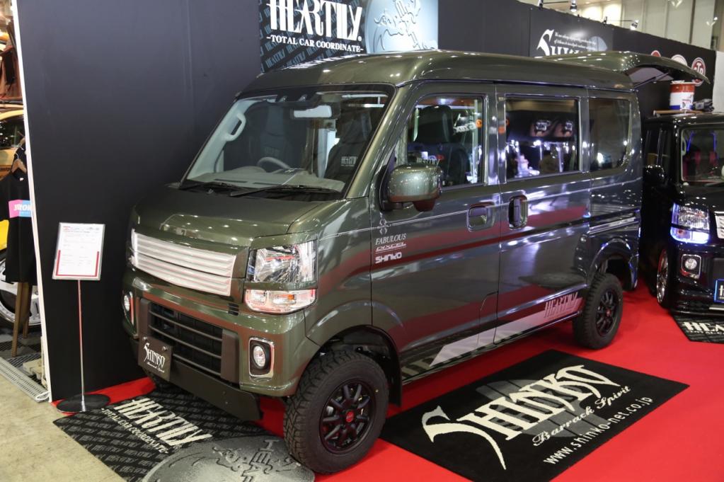 オリジナルアップサスを装着した、コンプリートカーを展示。バン車両へリヤバンパーをワゴンルックのショートバンパー、同じくフロントバンパーもショートタイプを発表製作中。内装はルーフコンソールキット&調整式ベットキットを装着し、ライト車中泊や多様な趣味に対応可能なコンプリートカーを発表いたします。