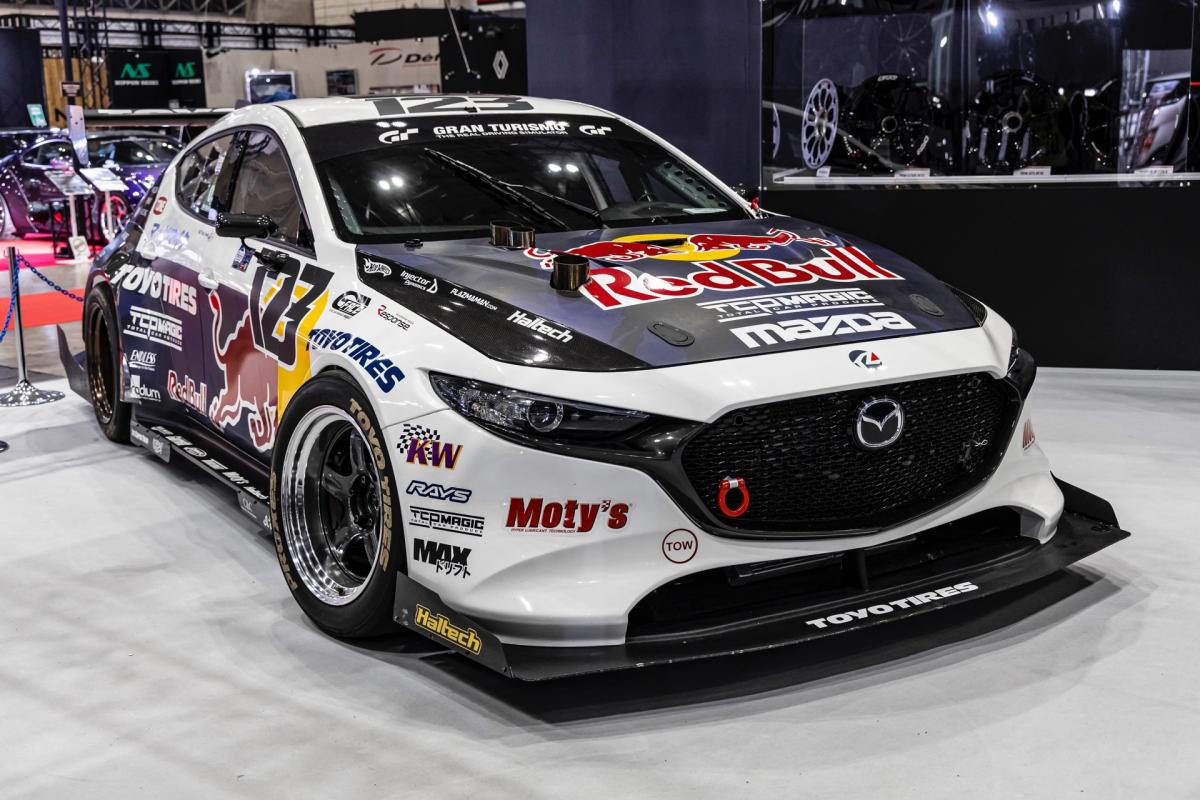 フォーミュラドリフトジャパンを始め、世界中のドリフト競技に参戦するマッドマイク選手が2023年パイクスピークインターナショナルヒルクライムに挑戦したTCP MAGIC MAZDA 3を展示。VOLKRACING VR21Cを装着し、パイクスピークを駆け上った車両が凱旋帰国。