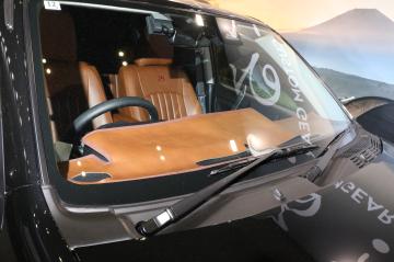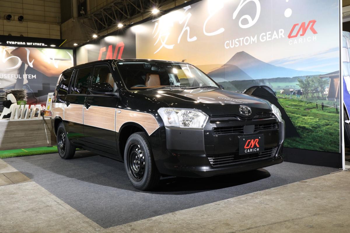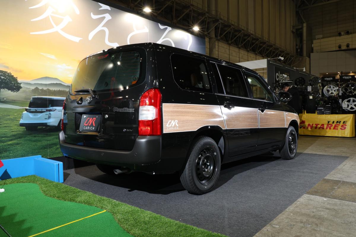 プロボックスの内装(シートカバー、ラゲッジスペースマット、ベットマット、車用クッション)を紹介するために車両を展示