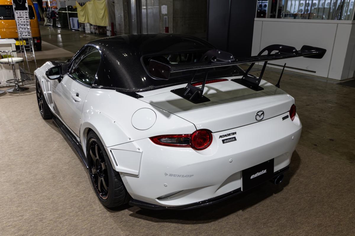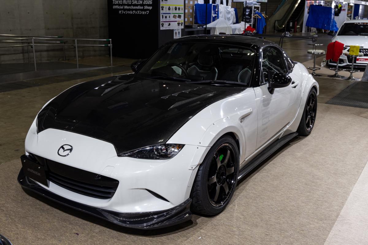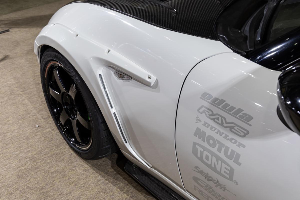 カーボンハードトップ、オーバーフェンダー、新作のリップスポイラー、GTウイングを装着、2000cc載せ替えのロードスターです。