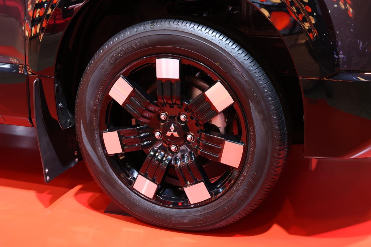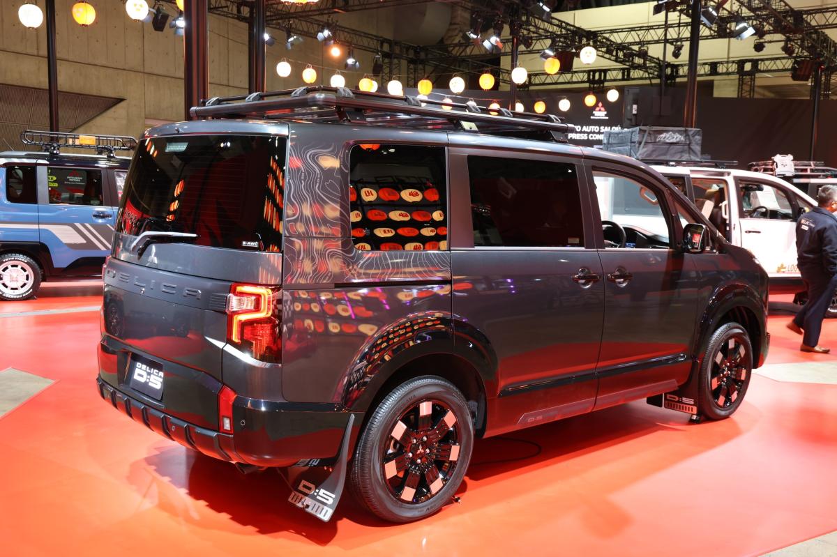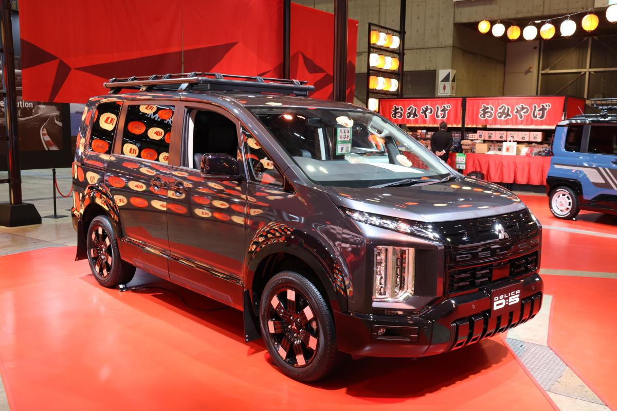 三菱自動車純正用品装着モデル。新設計したフラットキャリアや、ラリー車をイメージした吊りベルト付き大型マッドフラップ、無骨さ漂うステンレス製のリヤアンダーカバーなどを装着し、『デリカD:5』のタフさを最大限引き出しています。