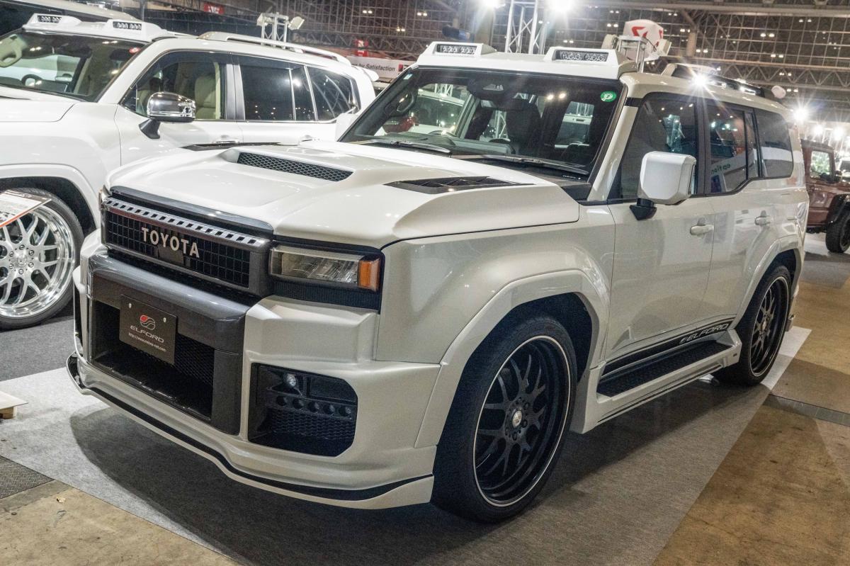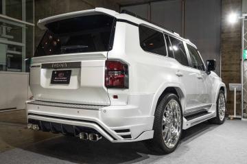 フロントとリアにはフルバンパータイプのスポイラーにサイドステップとフェンダーアーチとオリジナルのエアロボディキットに左右4本出しマフラー、そして日本製の鍛造24インチホイール”セレスティアル”を装着させたオンロードを意識した正にエルフォードと言えるランドクルーザー250に仕上げています。
