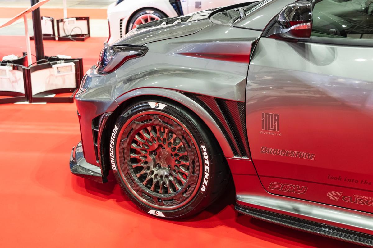 \nツライチサイズのタイヤ&ホイールを装着の場合に、保安基準(回転部分の突出禁止規制)を満たしやすくします。IMLA社とコラボで制作したホイールを装着し、展示します。