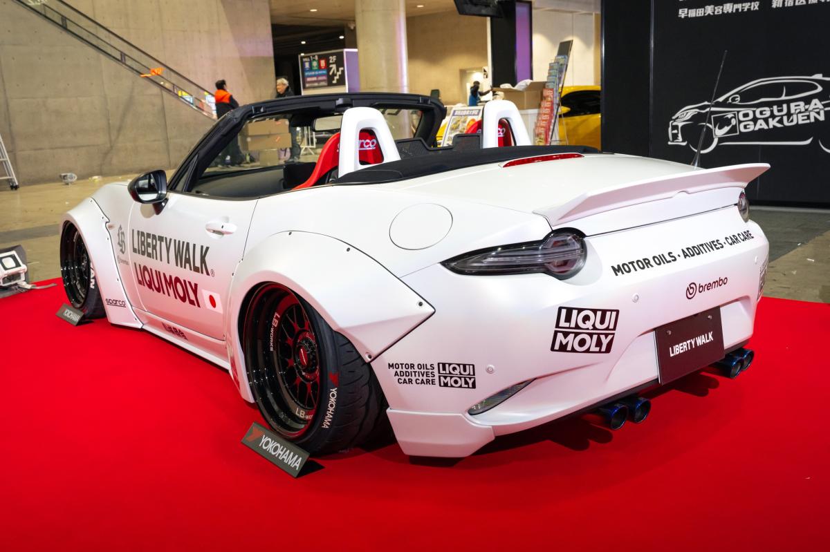 LIQUI MOLY(リキモリ)とLIBERTY WALK(リバティーウォーク)がタッグを組んだ、圧巻のコラボレーション・コンセプトカー。<br>ベースは、日本のライトウェイトスポーツの象徴「NDロードスター」。LBWKの代名詞であるビス留めオーバーフェンダーで武装し、車高は極限までローダウン。足元にはBrembo(ブレンボ)製キャリパー、インテリアには鮮烈なSparco(スパルコ)のレッドシートを覗かせます。<br>ドイツの「高性能」(LIQUI MOLY)、日本の「ストリート魂」(LBWK)、そしてイタリアの「情熱」(Brembo/Sparco)が完璧に融合した、国境を超える究極のカスタムです。