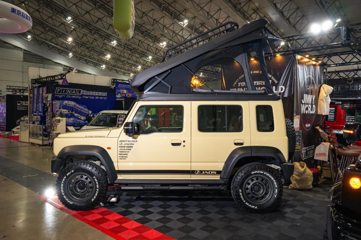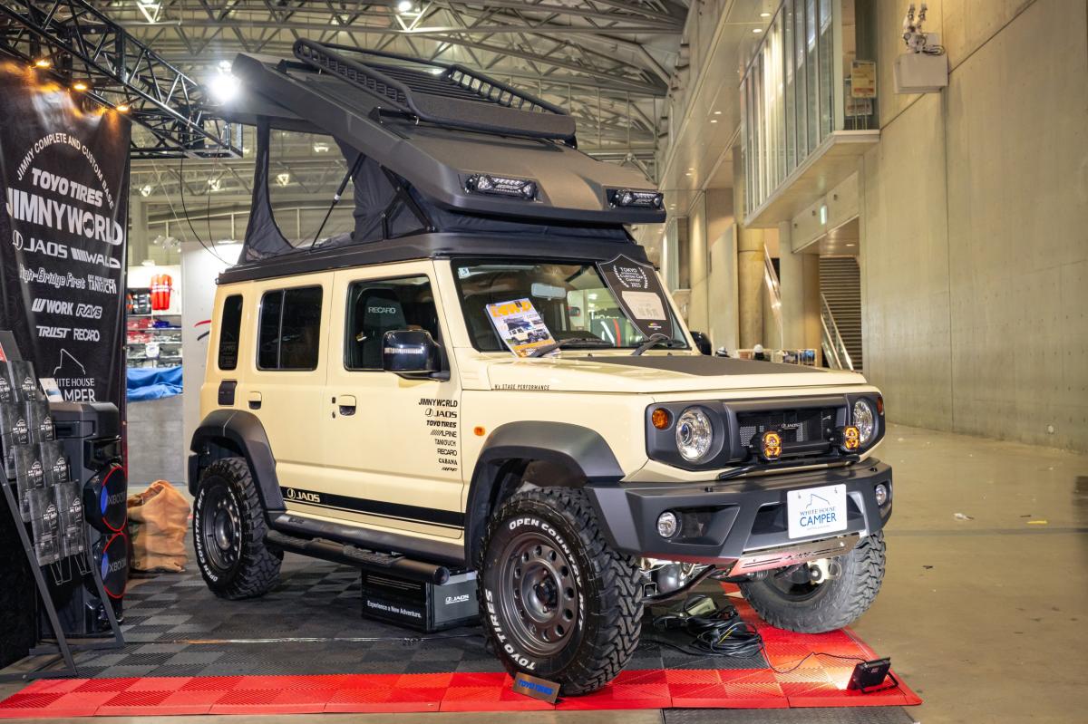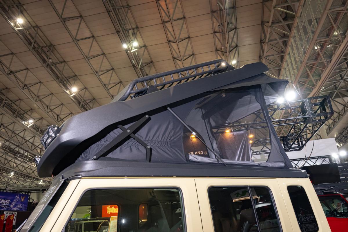 エヌズ・ステージが全国に展開する「ジムニーワールド」オリジナルカスタムモデル「エヌズリミテッド」のジムニーノマドジャオスエディションに、ホワイトハウスキャンパーがプロデュースするポップアップルーフを装着した販売モデルです。