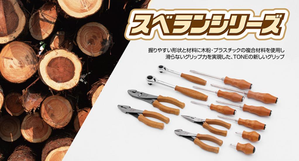 スベランシリーズとは、握りやすい形状と材料に木粉・プラスチックの複合材料を使用し、滑らないグリップ力を実現した、TONEの新しいグリップを採用した製品ラインアップです。