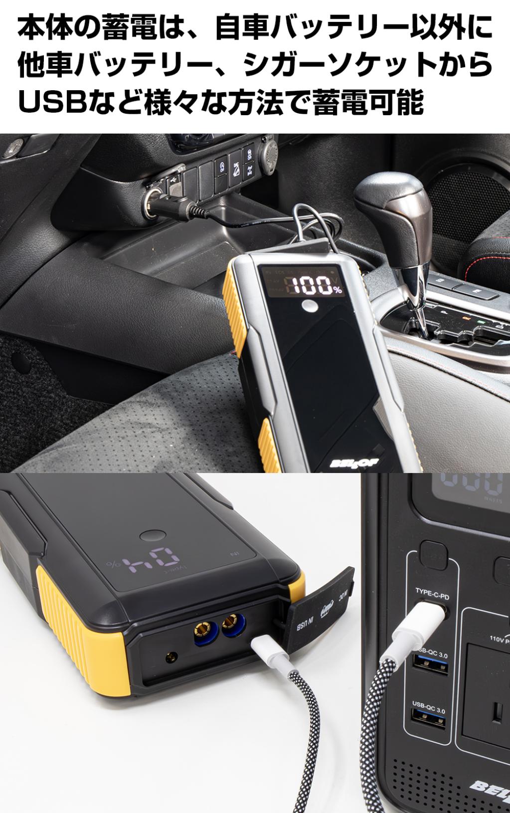 使用するときに自車のバッテリーから、他の自動車バッテリーから、12Vシガーソケットから、USB Type-Cからいずれかの方法でつなぎジャンプスタートが可能となります。