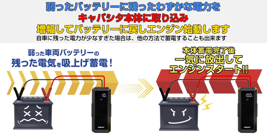 弱った車両バッテリー(9V以上)からキャパシタ本体に電気を吸い上げ、車両バッテリーへ一気に放出する事でエンジン始動が出来ます。