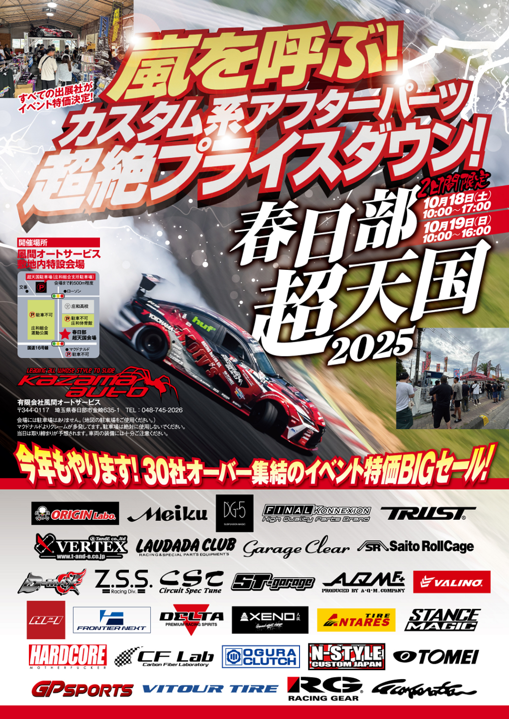 有限会社風間オートサービス様の敷地内特設会場にて、毎年恒例となっている「春日部超天国」が開催されます。