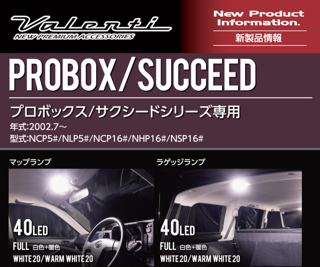 ヴァレンティより新製品プロボックス/サクシード専用ジュエルLEDルームランプセットトライトーンリリース!