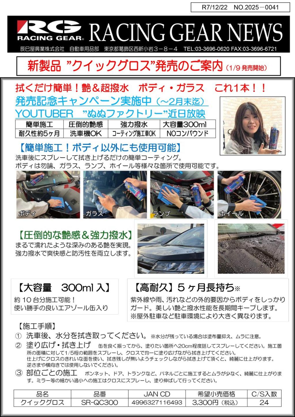 RACING GEARは、洗車後のコーティング作業を短時間で完了させたいというユーザーの声を受け、簡単施工で高い艶と撥水性能を発揮するコーティング剤「SRクイックグロス」を、2026年1月9日より発売いたします。